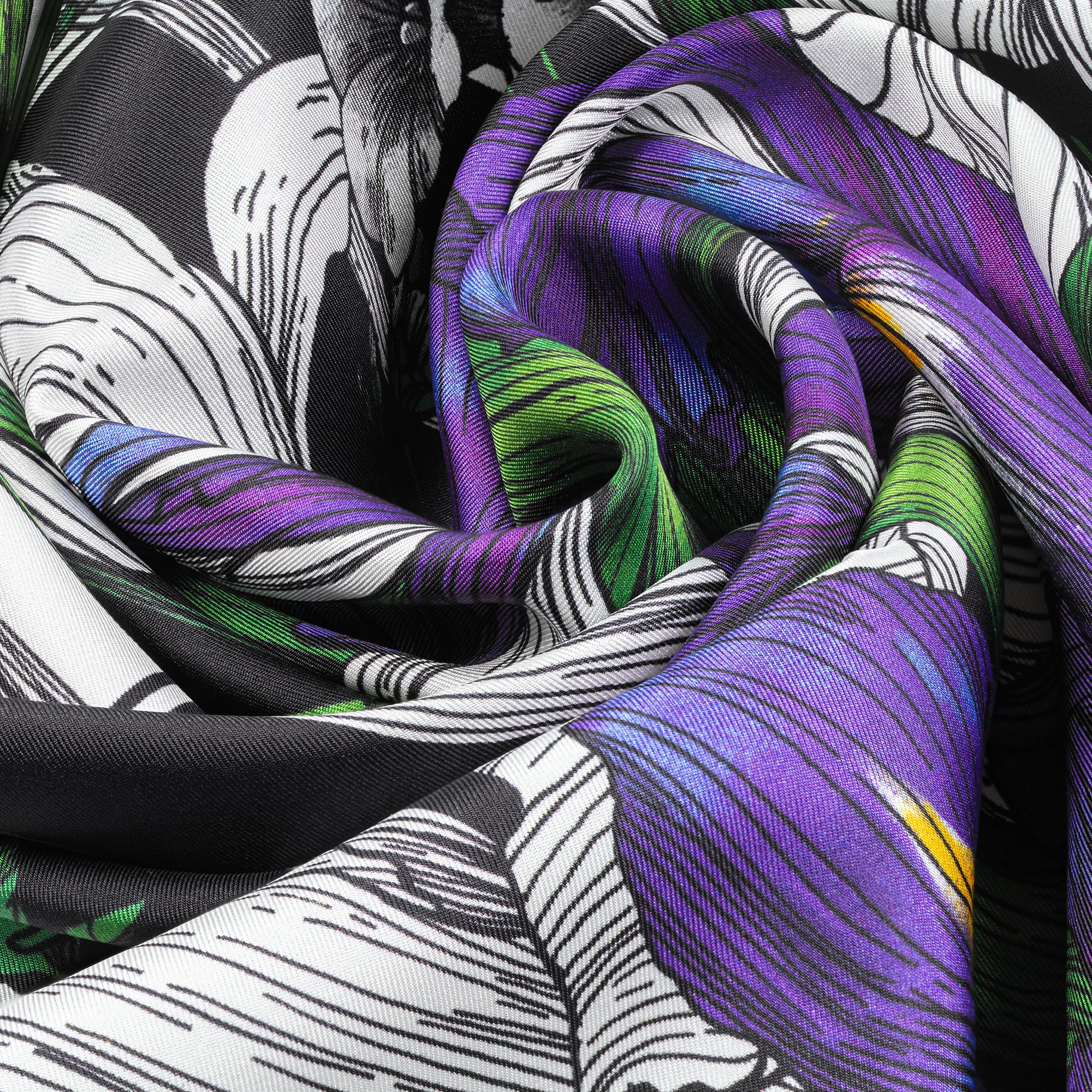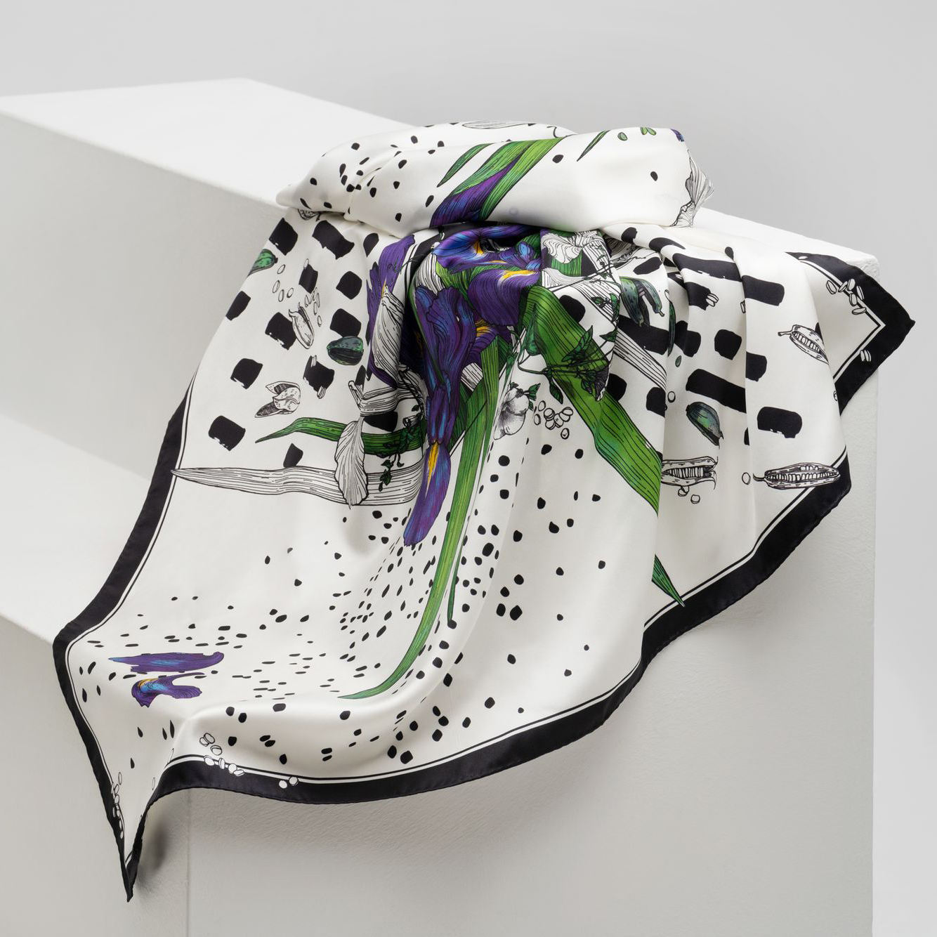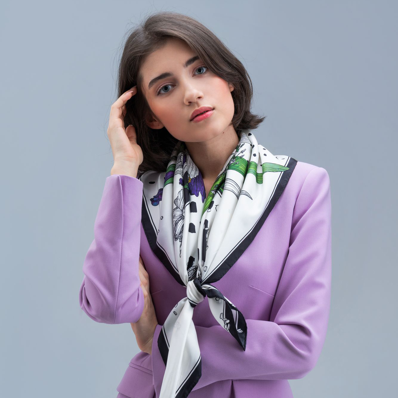A silk handkerchief with a floral print opens up a lot of imagination — it can be used as a scarf, headdress or decorative element for outerwear and accessories.