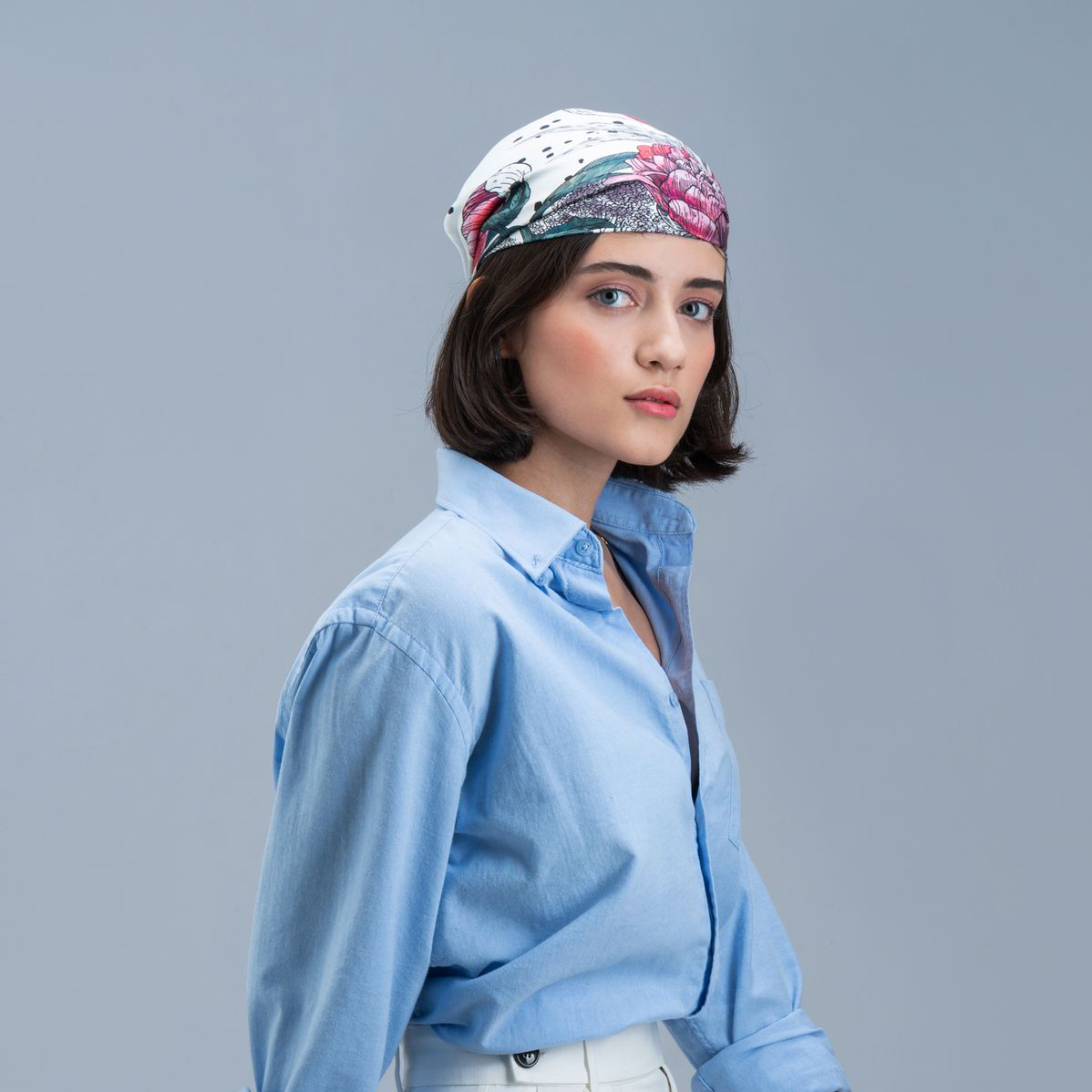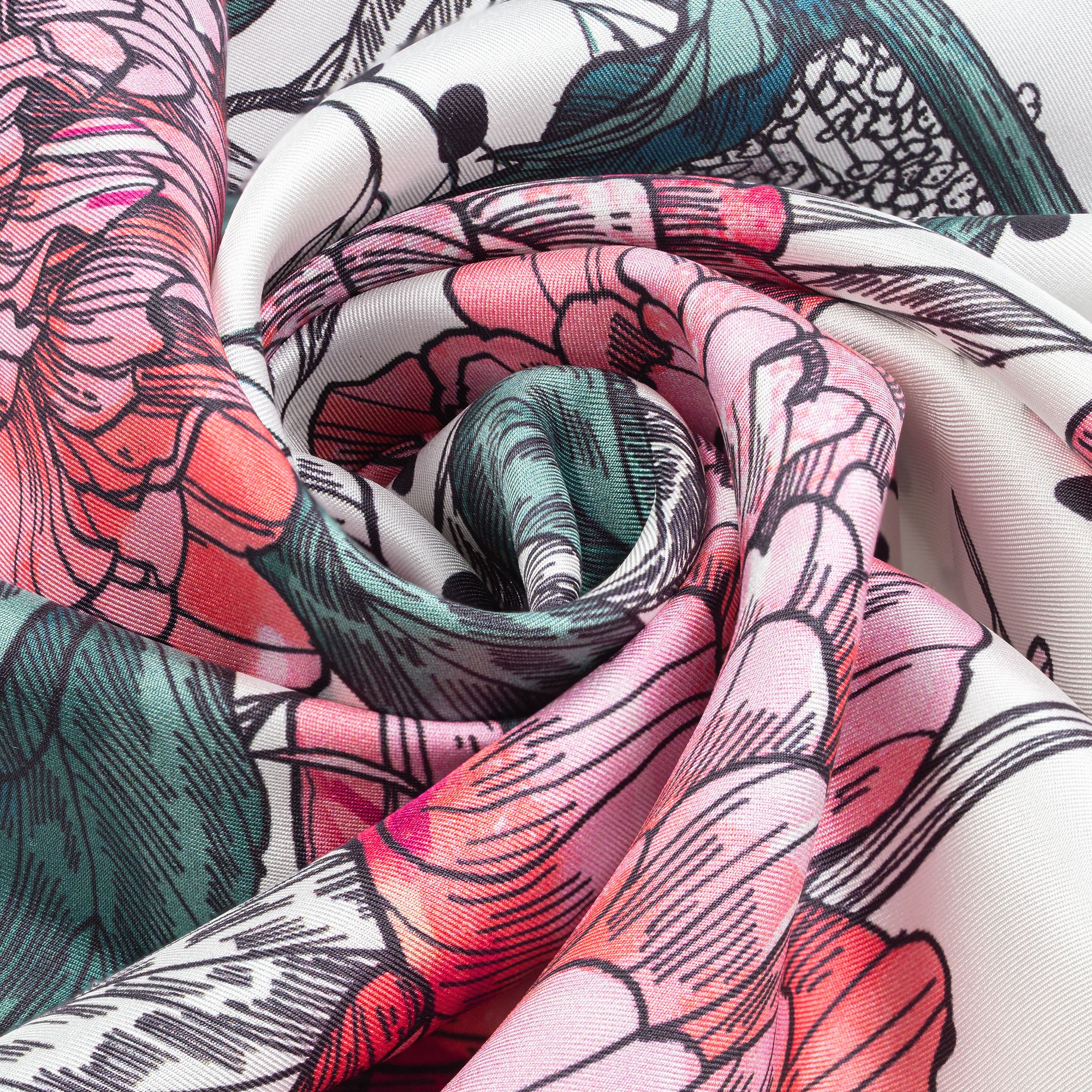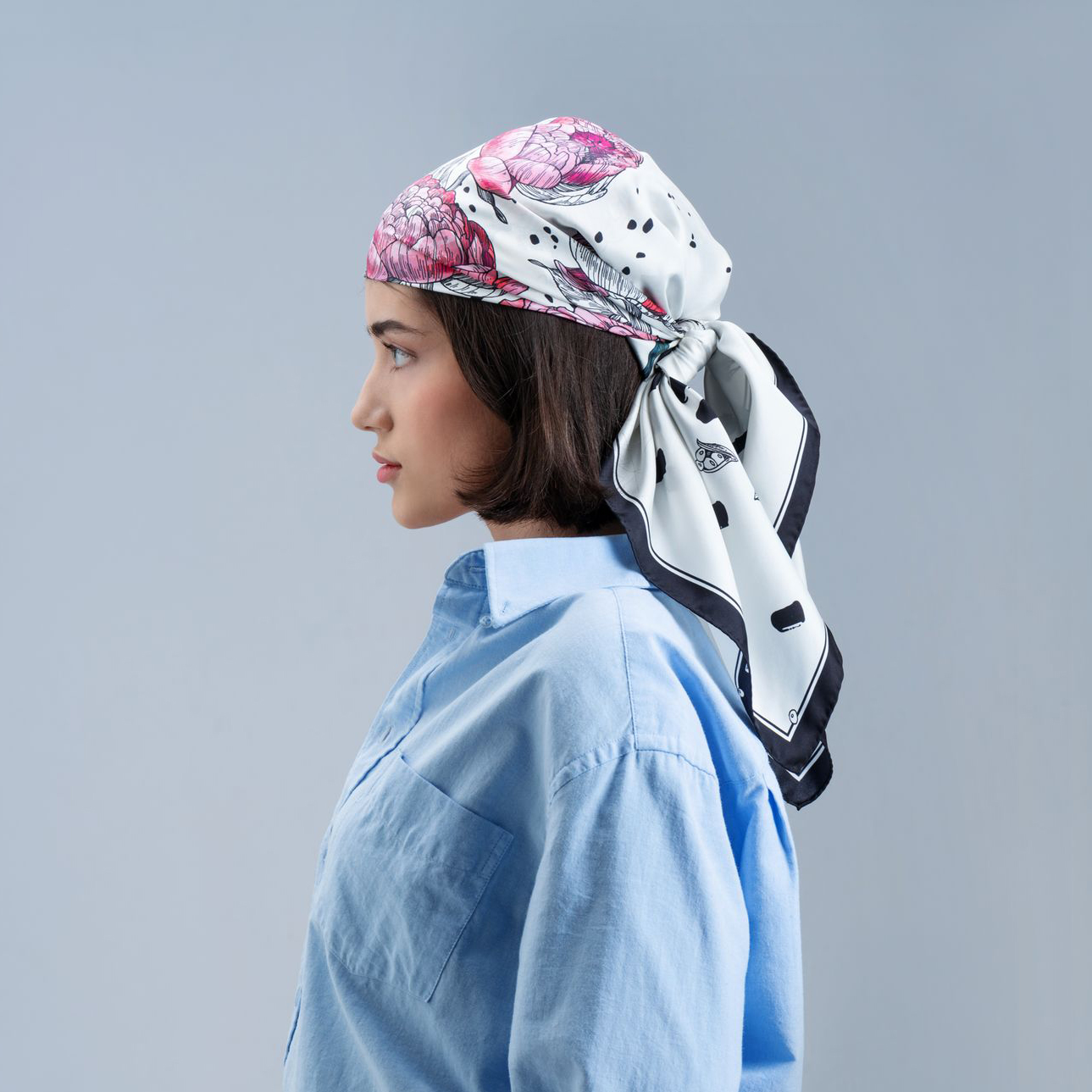 A silk handkerchief with a floral print opens up a lot of imagination — it can be used as a scarf, headdress or decorative element for outerwear and accessories.