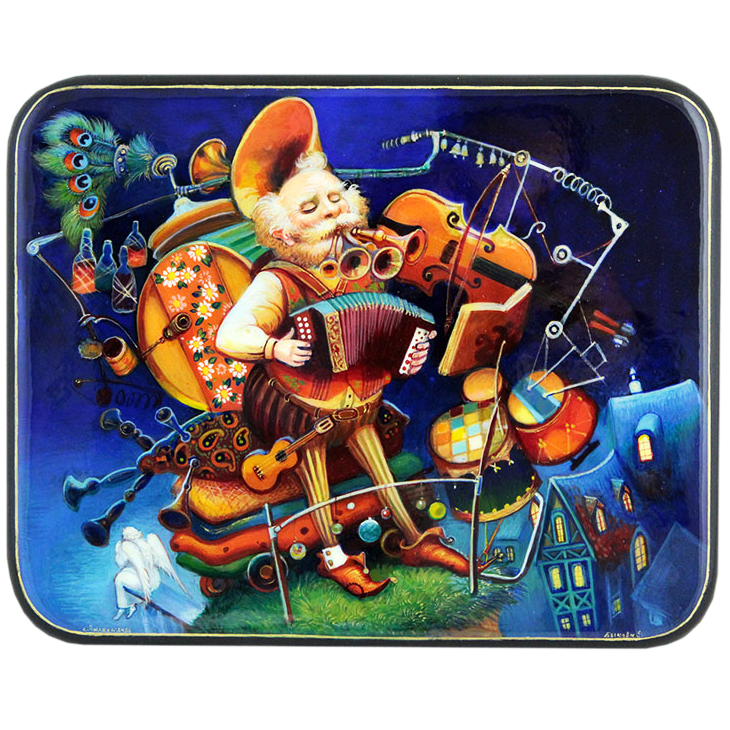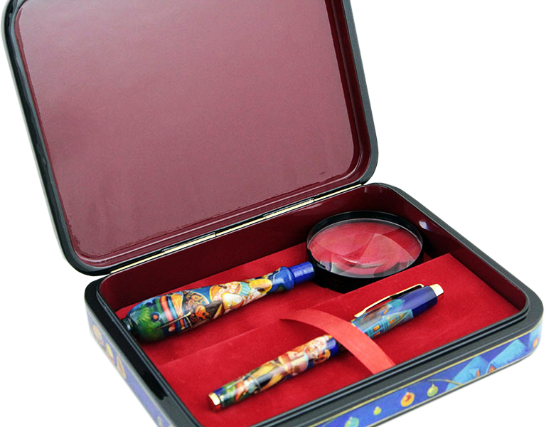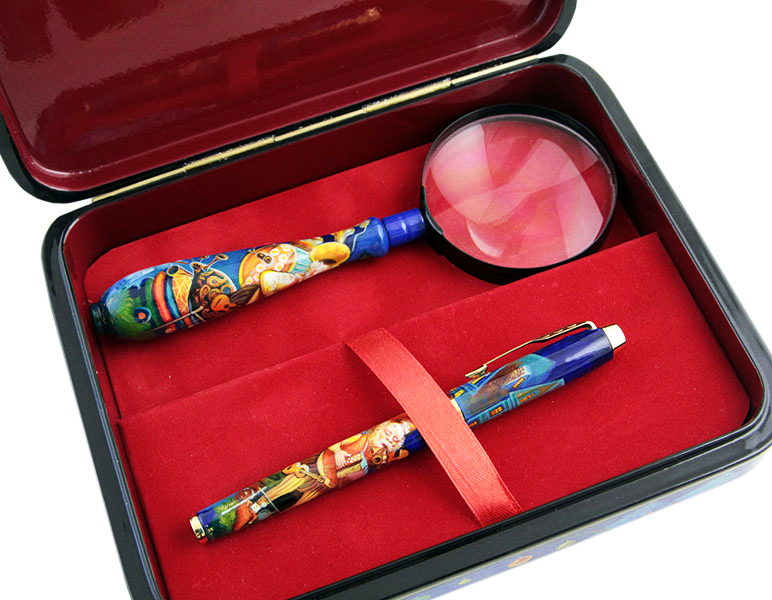 Set with a pen and magnifying glass "Musician" in a box, Palekh