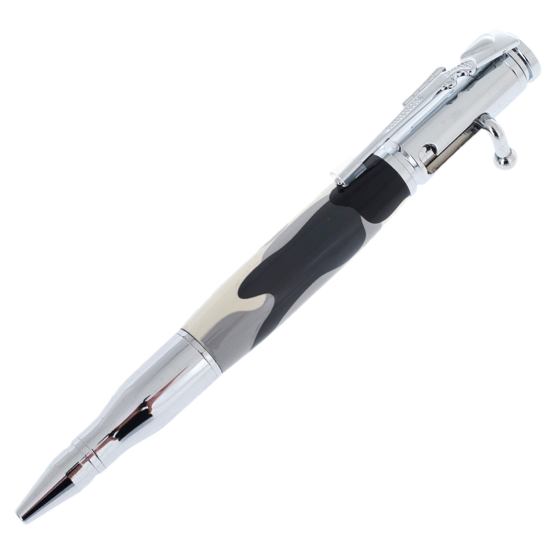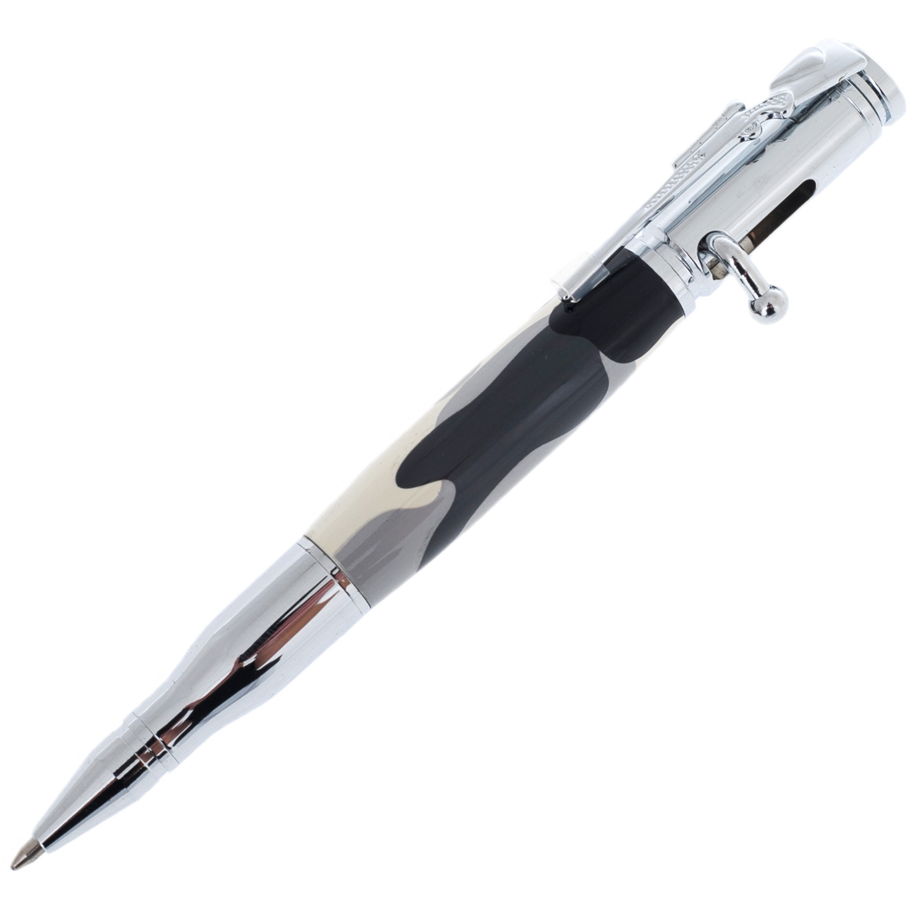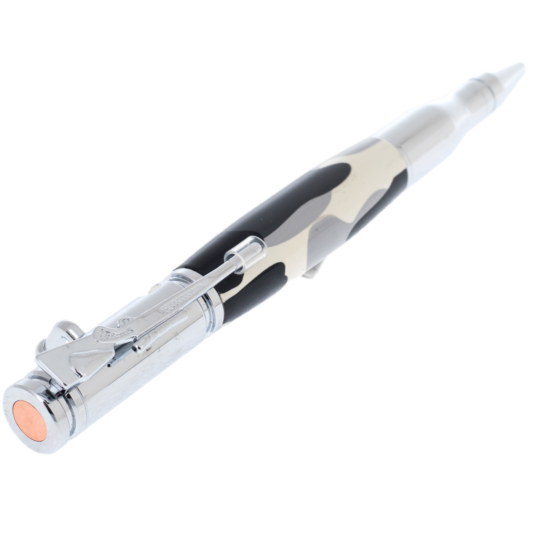 The Cartridge ballpoint pen in winter camouflage is not just a stationery accessory, but a symbol of strength and determination. Its massive shell, made in the style of a cartridge, combined with a white and black camouflage design, conveys the energy of a real warrior who is able to overcome any obstacles. The cold gleam of the metal handle evokes associations with a weapon that is both elegant and powerful. The mechanism, stylized as a rifle bolt, gives the product a feeling of combat readiness.