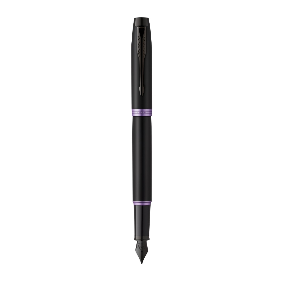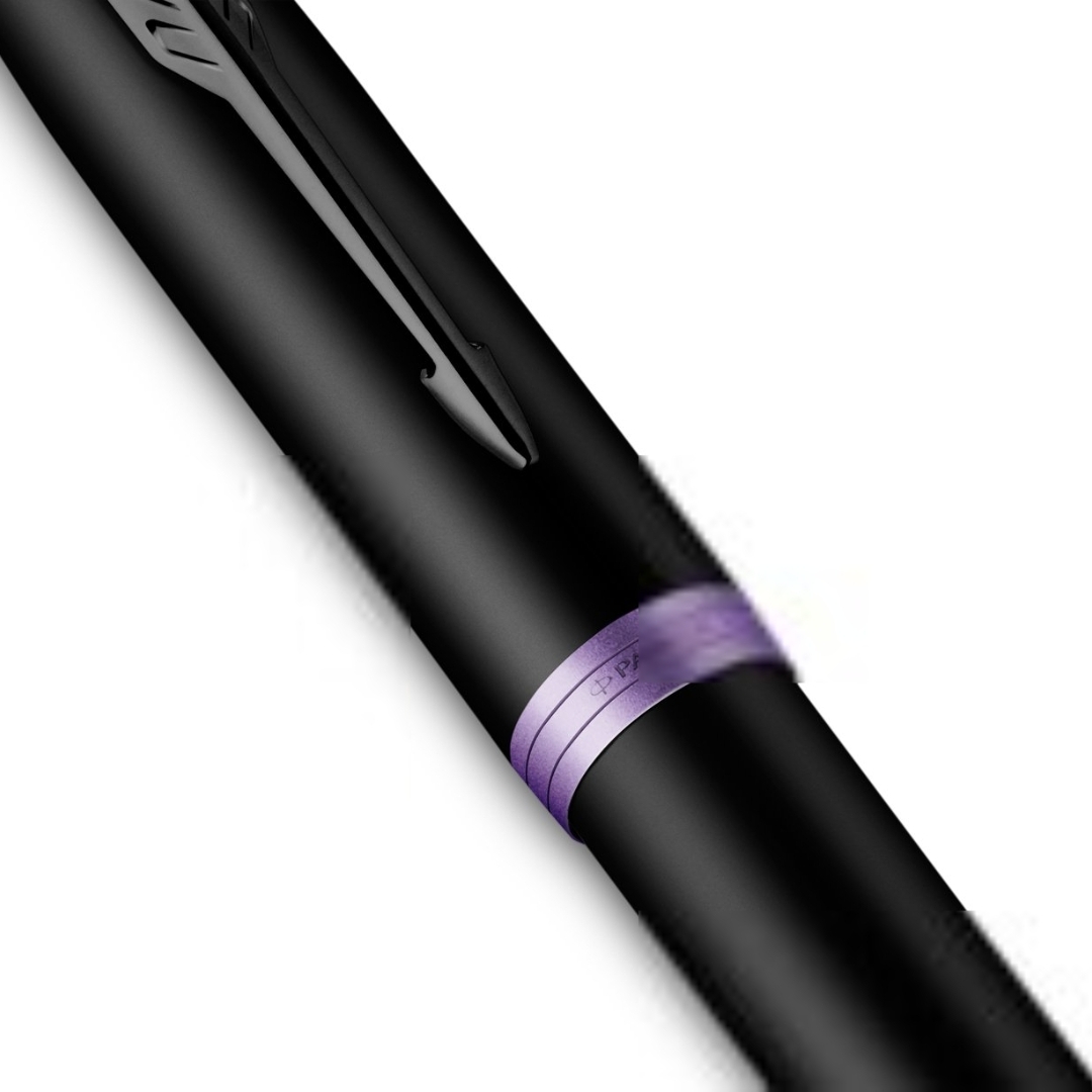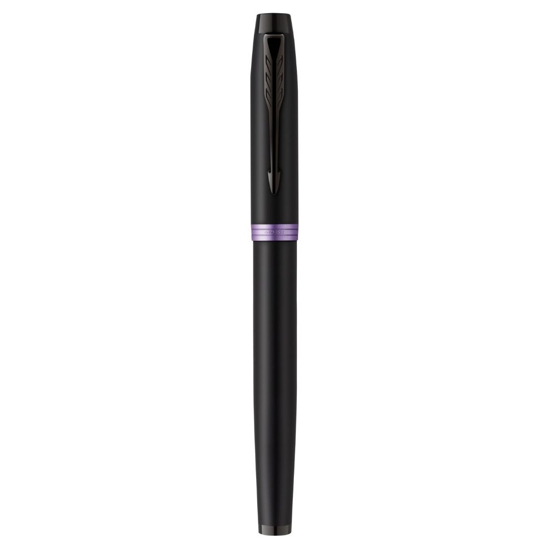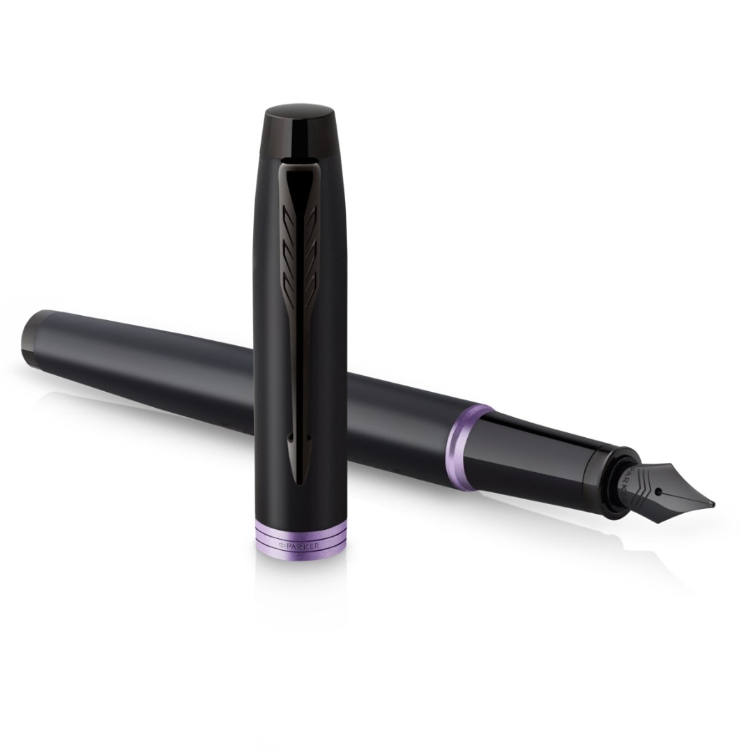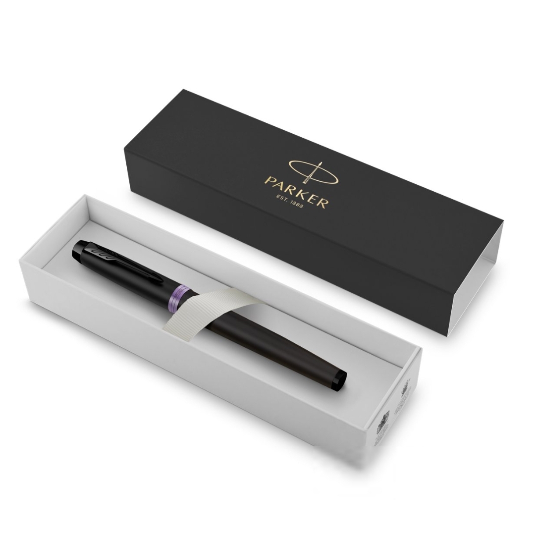 Parker IM Vibrant Rings Flame Amethyst Purple fountain pen in a gift box.
