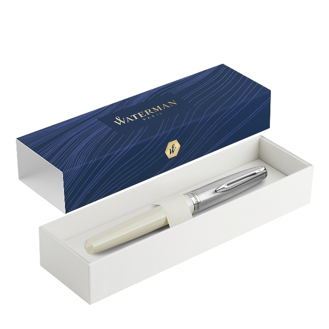 Waterman Embleme roller pen in IVORY CT color in a gift box.