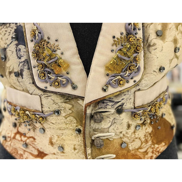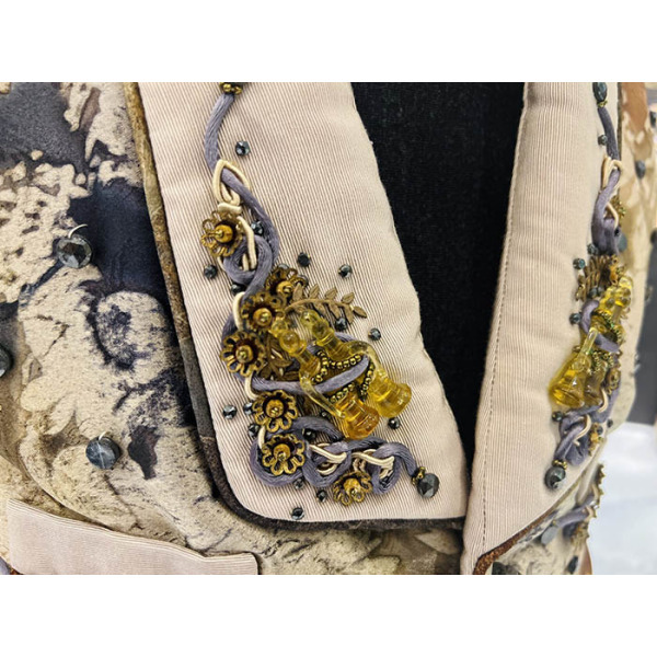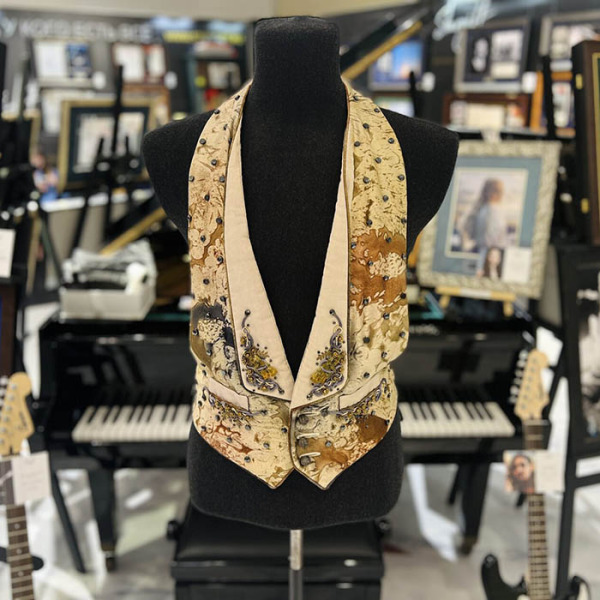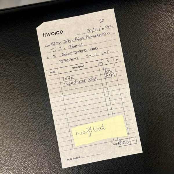 A mottled vest in brown and gold colors with embroidery and beaded jewelry, made for Elton John by designer Kenneth King. The label says "KDK Kenneth King Design 196 010". The exhibit is accompanied by an invoice from the Elton John AIDS Foundation in the amount of 95 pounds dated November 30, 1994.