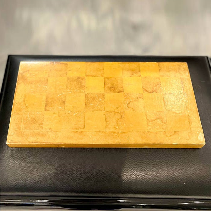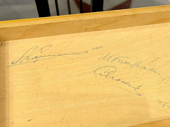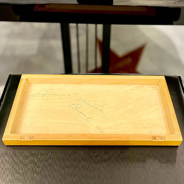 Part of the chessboard with autographs of chess players: Mikhail Botvinnik, Anatoly Karpov, Vasily Smyslov