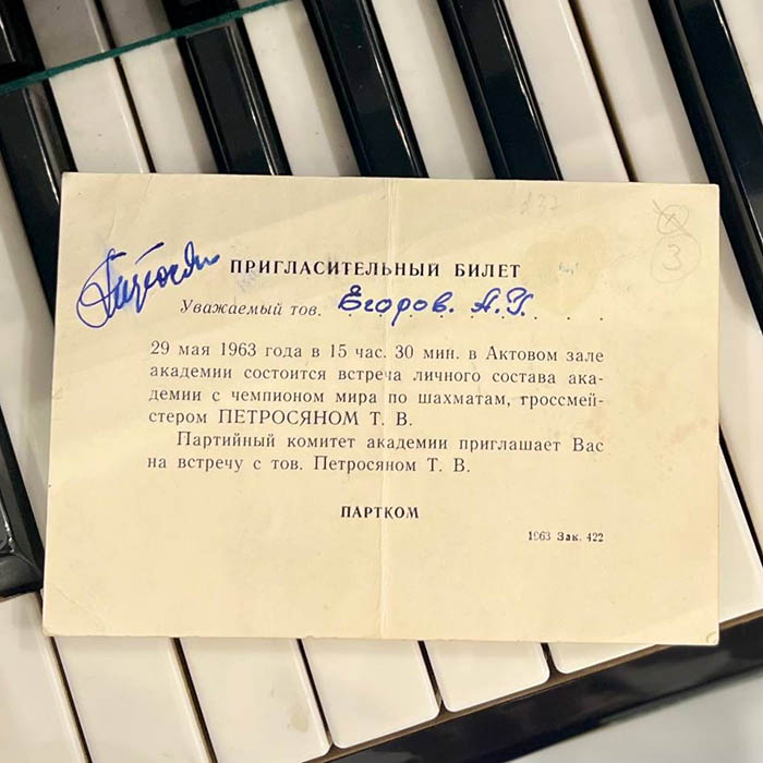 An invitation card signed by chess player Tigran Petrosyan