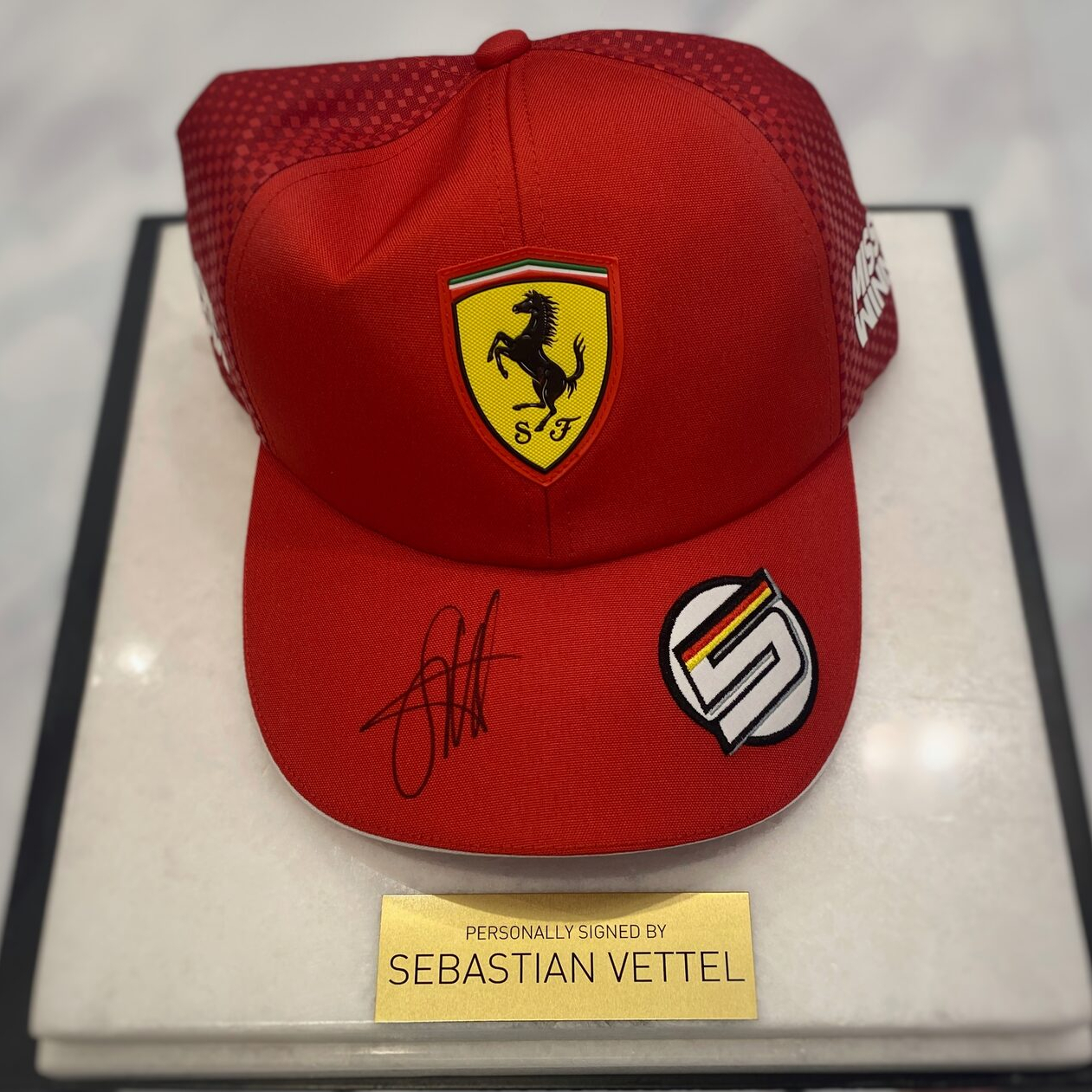 Autographed cap of racing driver Sebastian Vettel, white marble