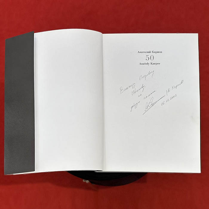 The book "Anatoly Karpov. On the 50th anniversary of the twelfth World Chess Champion" with an inscription and an autograph