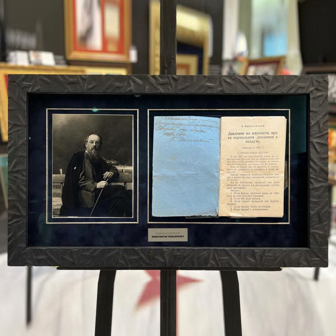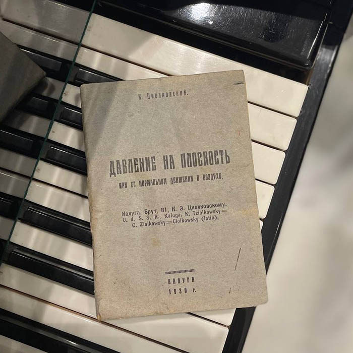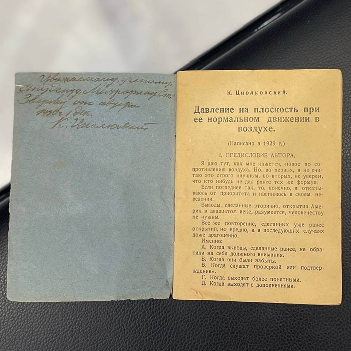 The book "Pressure on a plane during its normal movement in the air" with an autograph by Konstantin Tsiolkovsky in 1930.