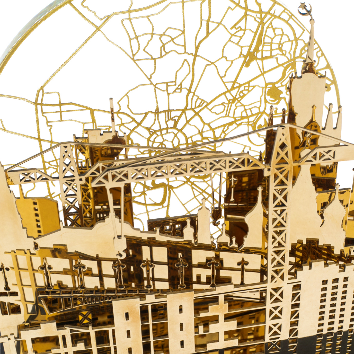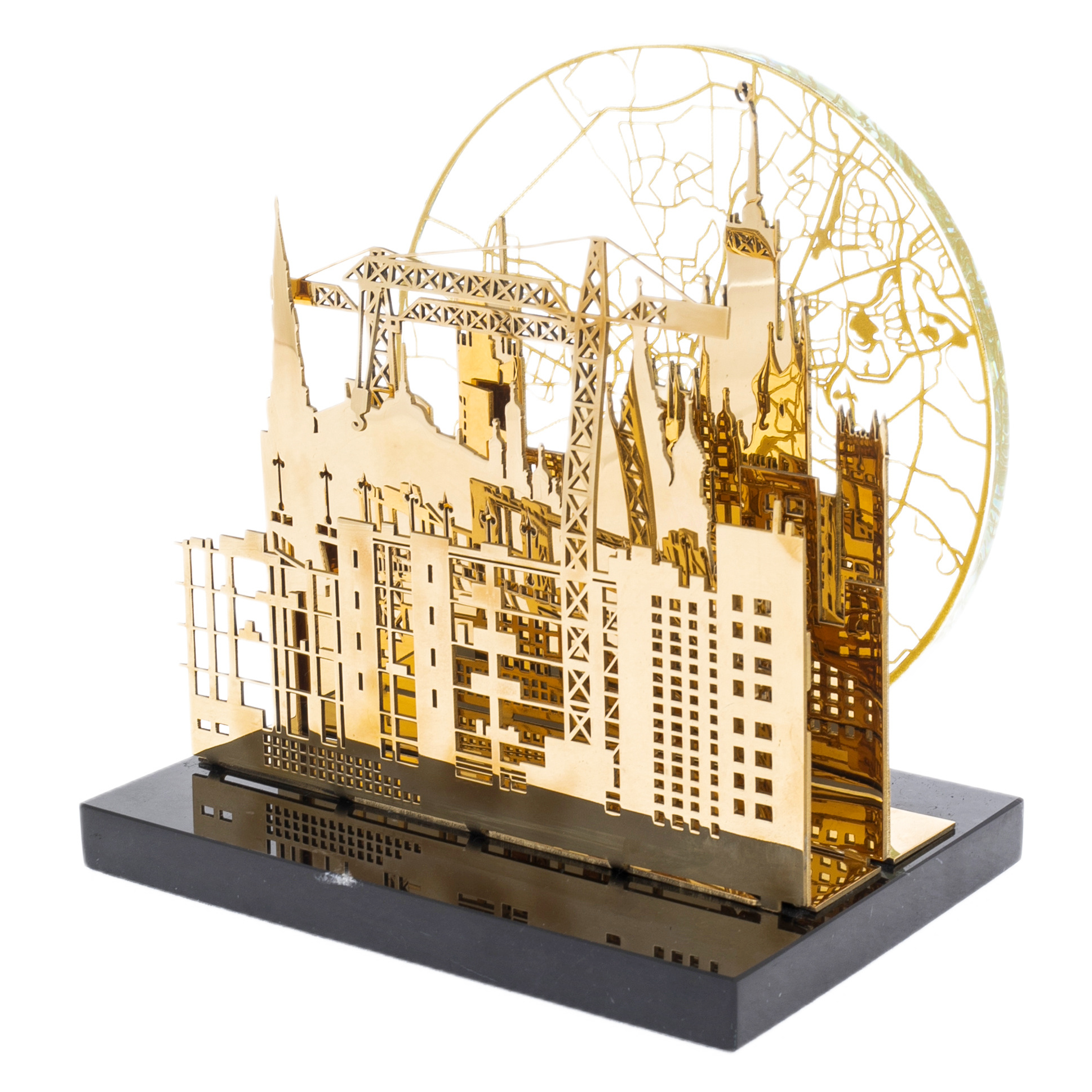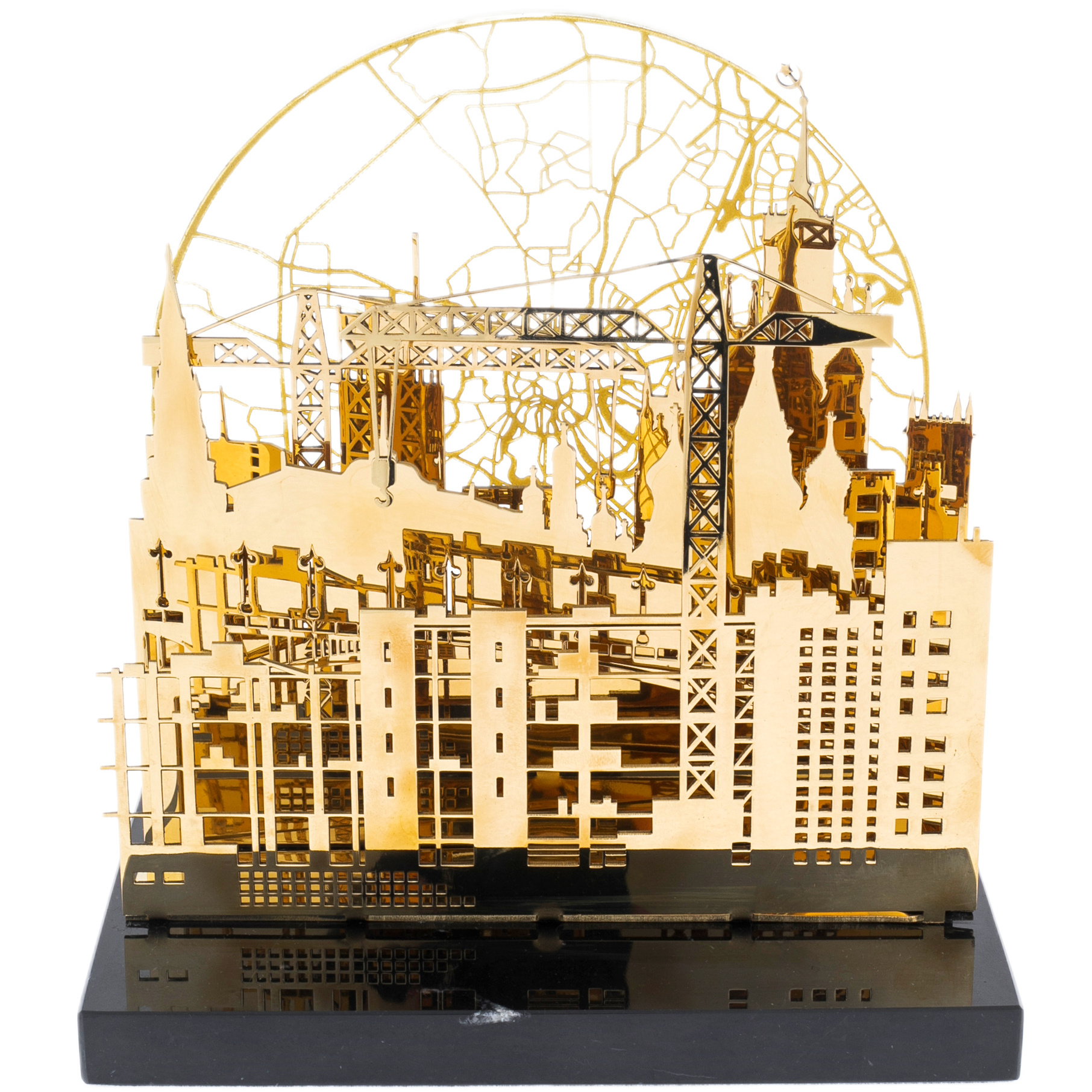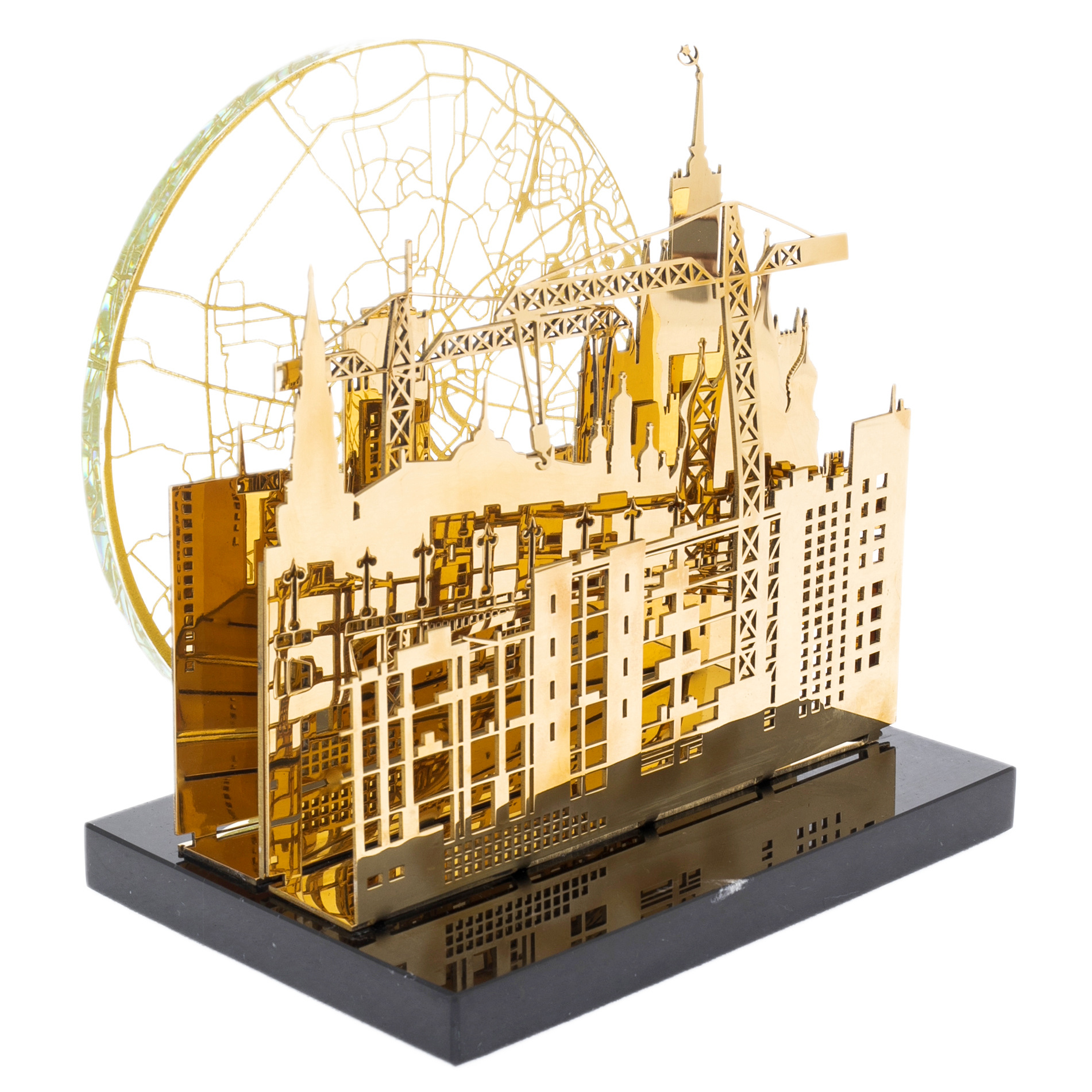 On a massive base of black stone stands a complex structure, carved with filigree precision. Here, as on a theatrical stage, the silhouettes of Moscow buildings come to life: majestic spires, monumental facades and modern construction cranes rushing into the sky like bridges between epochs. In the background, a disk with a contour map of Moscow shines, like the light of the moon or the rising sun, symbolizing the eternal movement of the metropolis.