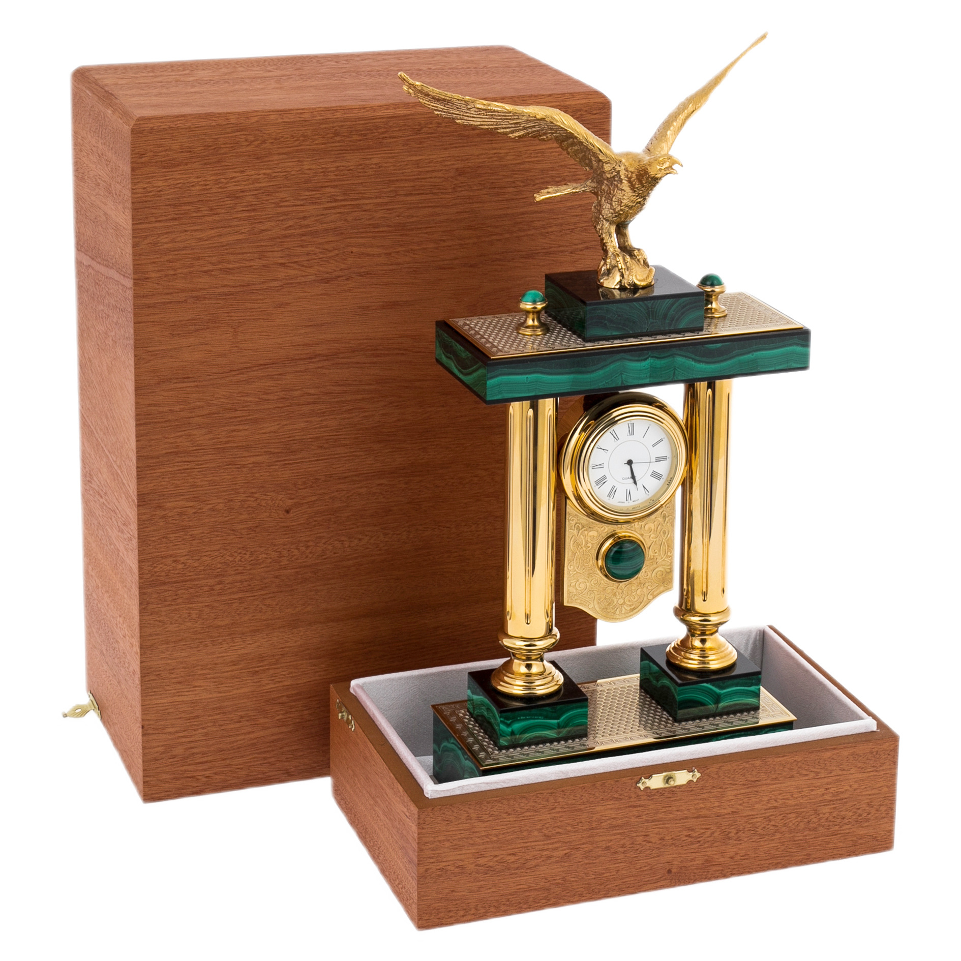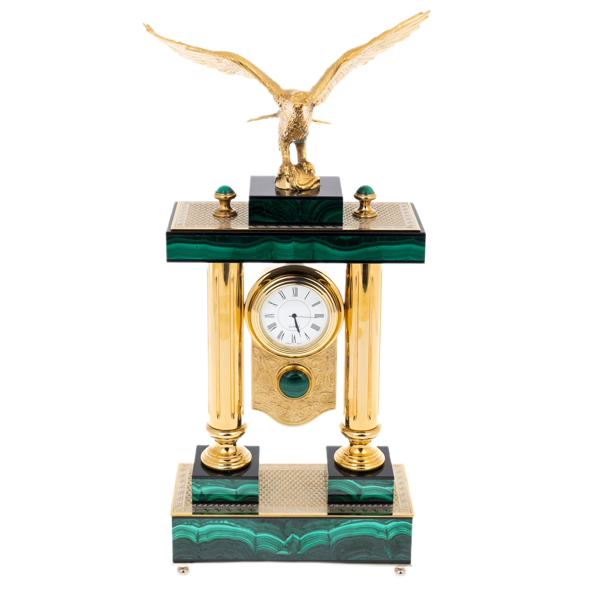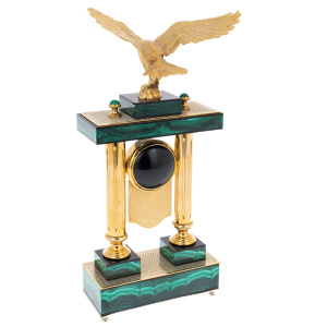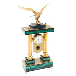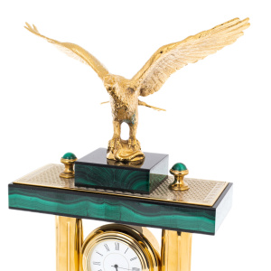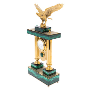 Орёл, венчающий конструкцию, формирует основной смысл изделия: высота взгляда, уверенность решения, власть над временем и обстоятельствами. При боковом свете позолота даёт тёплый, плотный блеск, малахит отвечает бархатной глубиной, а орнаментальные поверхности проявляют тонкую фактуру, сохраняя ощущение ручной работы. Эти часы предназначены для человека, воспринимающего интерьер как продолжение характера, выбирающего редкие предметы с ясной символикой и дорогими материалами. "Орёл" является достойным подарком первого уровня — руководителю, партнёру, коллекционеру, тем, чьё время действительно имеет цену.