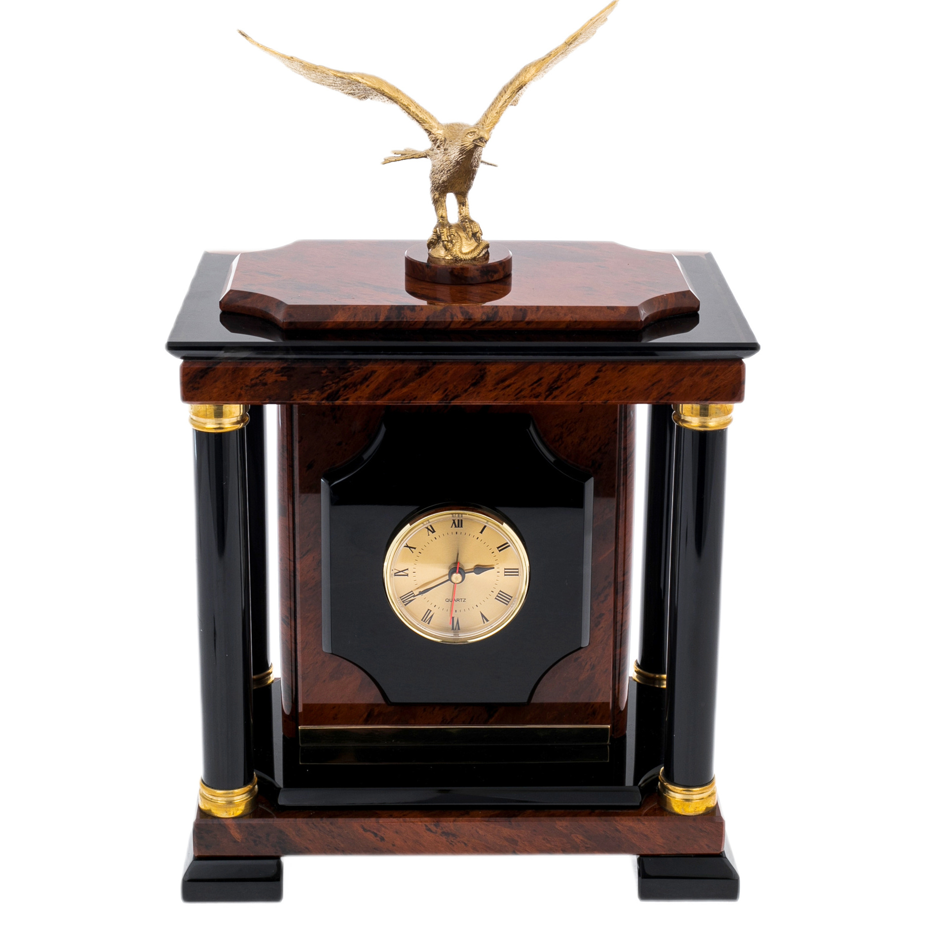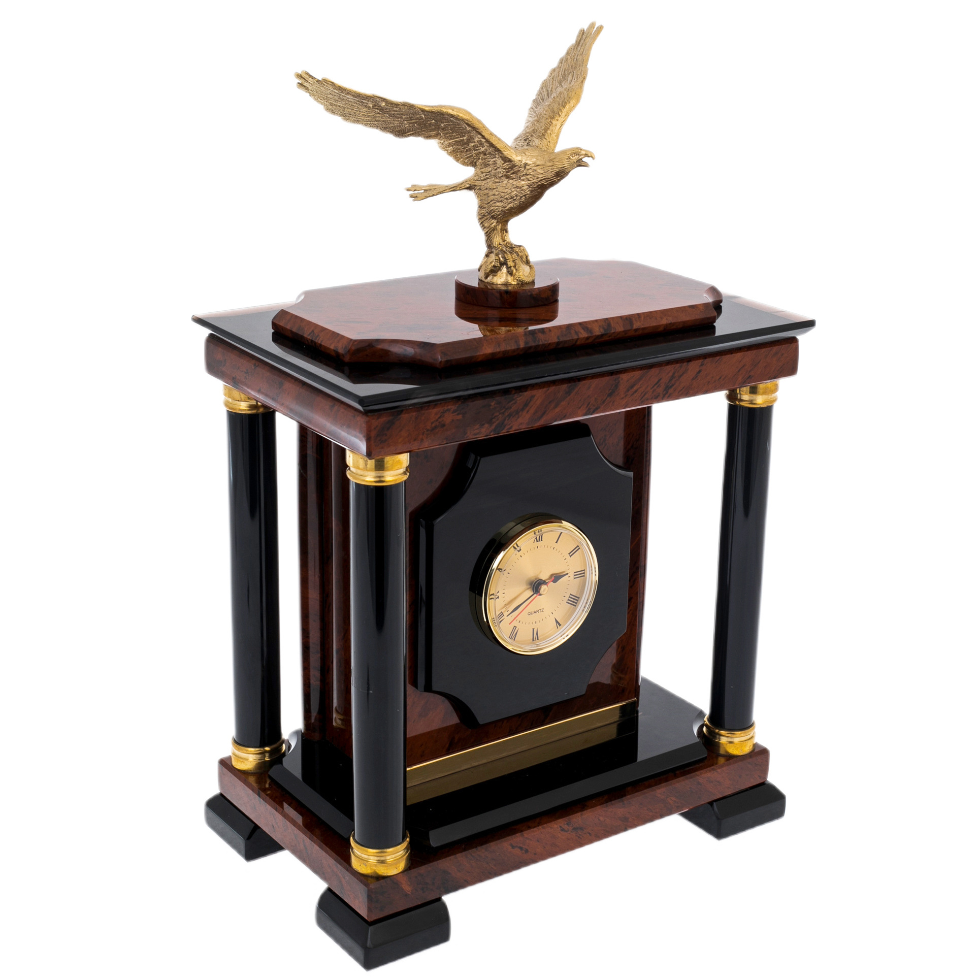 Сочетание обсидиана, дерева и металла даёт ощущение устойчивости и порядка, где каждая грань отражает свет ровно и сдержанно. "Орёл" воплощает идею личного пространства, защищённого и организованного, а также превосходно выглядит на столе руководителя или в представительском кабинете. В нём чувствуется авторская работа мастеров Златоуста, соединяющих силу природного камня с точностью металла и художественным тактом. Эти часы — не просто хранитель времени, а инструмент власти над ним, подарок, в котором функциональность и символика слились в образе, понятном лишь тем, кто умеет ценить настоящее.