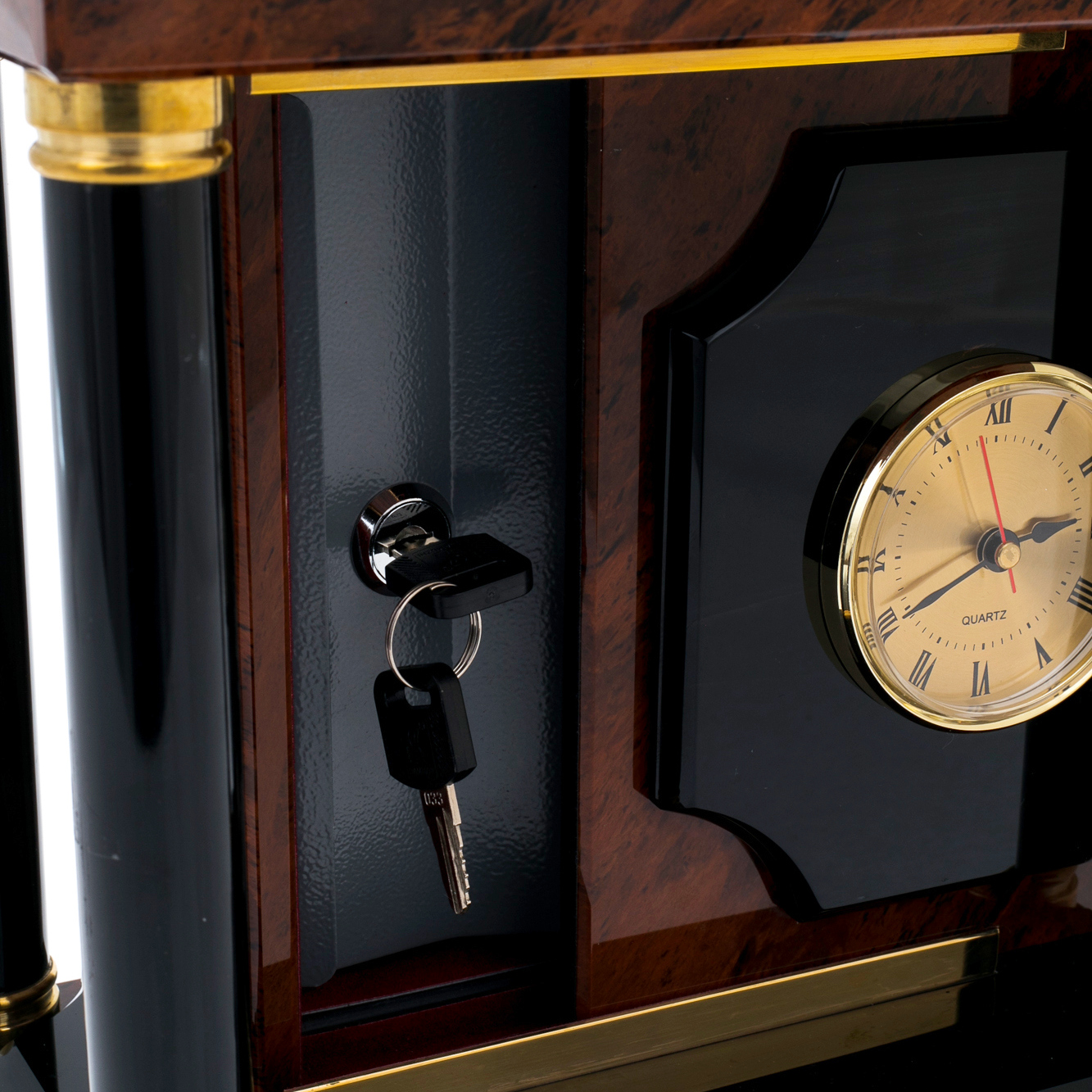 Обсидиан, выбранный для корпуса, отполирован до зеркального блеска и раскрывает насыщенный, почти бездонный черный тон с лёгким шелковым отливом. В сочетании с элементами, покрытыми позолотой, камень приобретает благородную глубину, подчёркивая холодную строгость конструкции. Циферблат с римской разметкой заключён в металлическое кольцо мягкого золотистого оттенка, и на фоне темного камня его световое пятно выглядит как центр притяжения. За фасадом часов скрыт сейф — компактный, но прочный отсек, снабжённый замком с ключом, аккуратно вмонтированным в корпус. Эта деталь добавляет предмету личный смысл: внутри можно хранить документы, украшения или символические вещи, значимые только для владельца.
