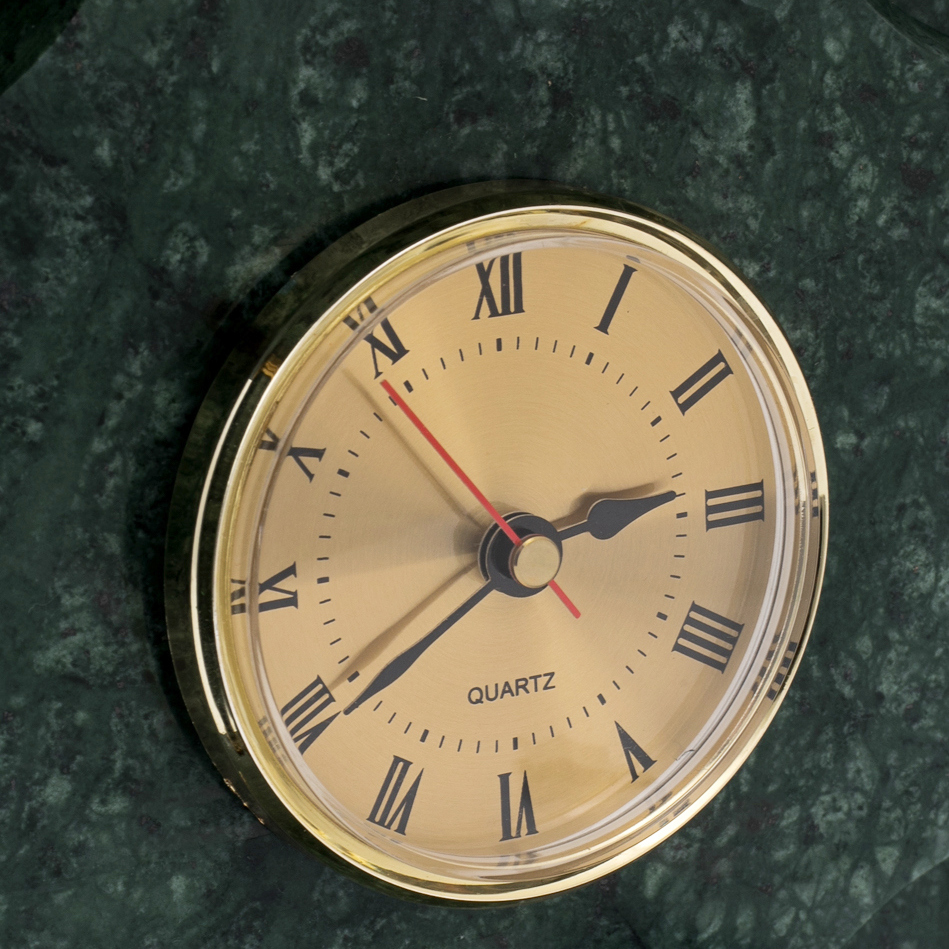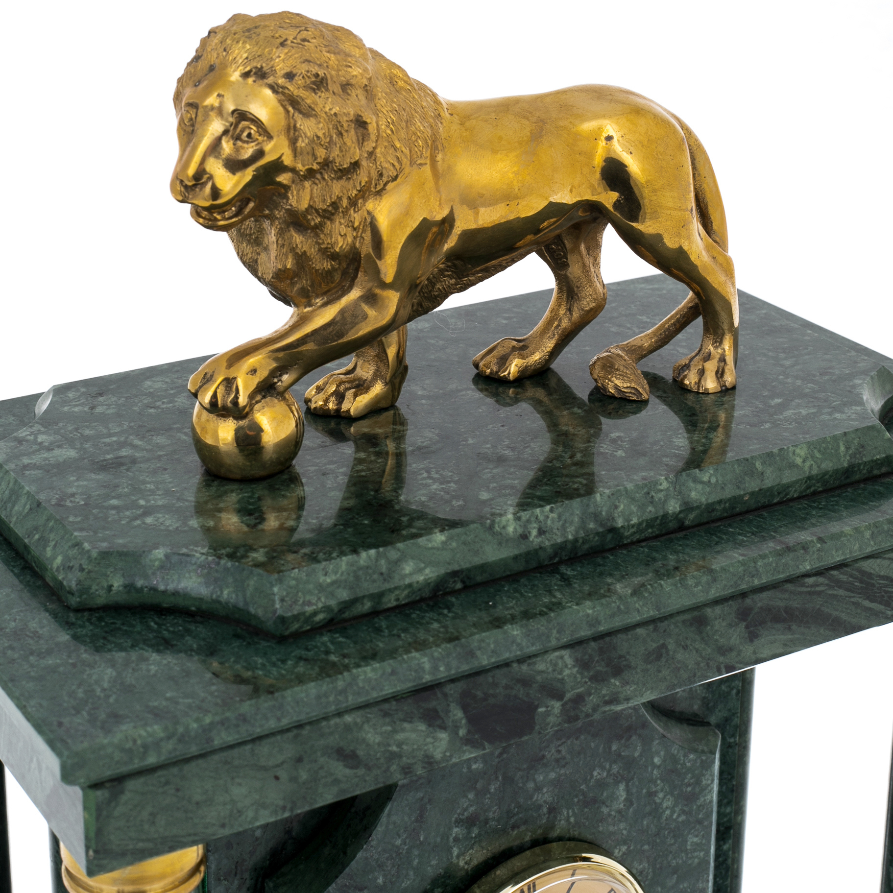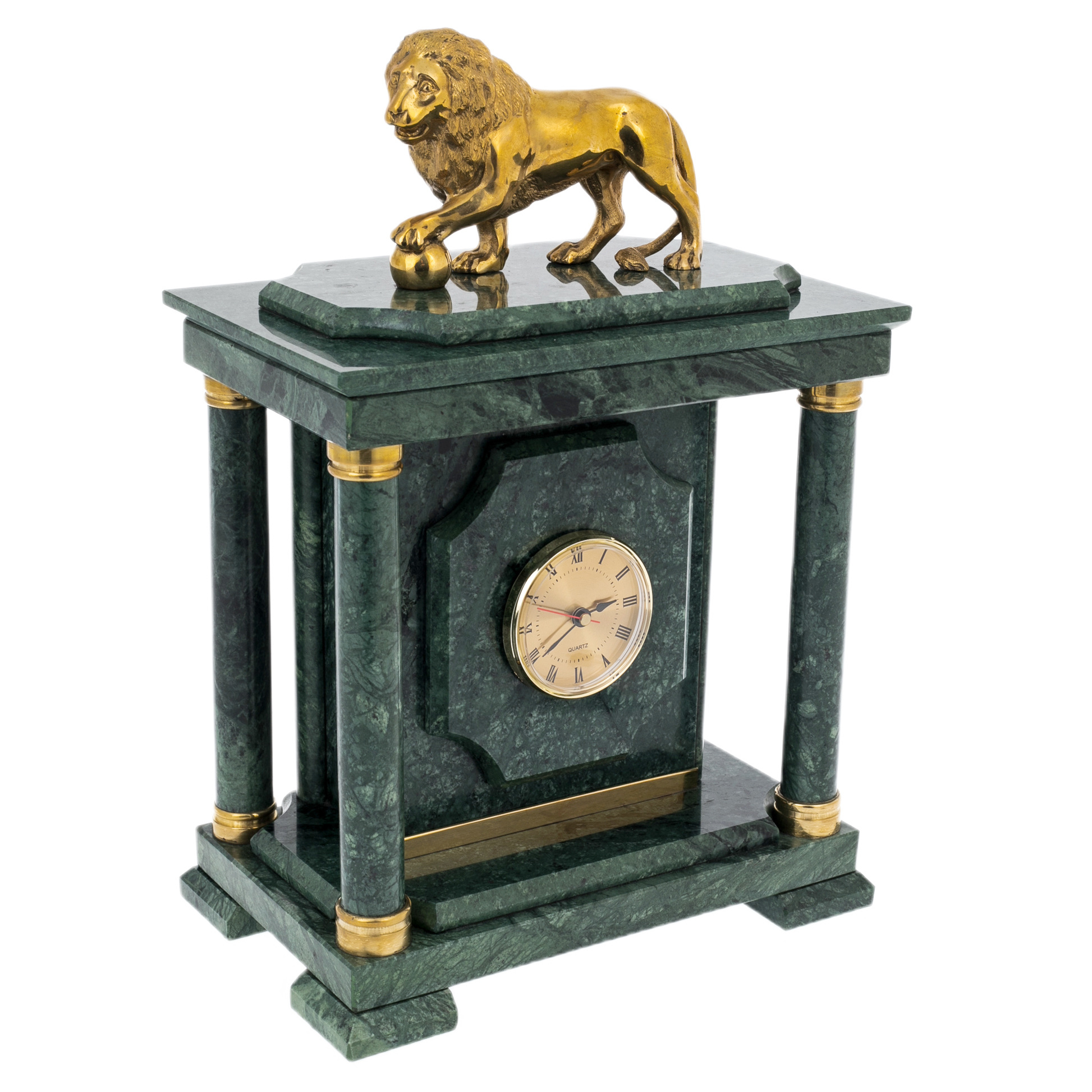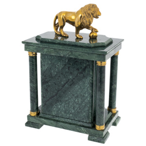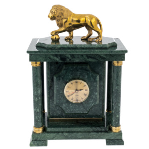 Часы-сейф из зелёного мрамора "Лев" — предмет, объединяющий эстетику классической архитектуры и функциональность, востребованную в кабинете человека с высоким уровнем доверия. Корпус выполнен из цельных плит мрамора насыщенного изумрудного оттенка, поверхность которого отполирована до зеркала и играет природными прожилками. Фасад оформлен в виде строгого портала с двумя колоннами по сторонам, поддерживающими массивный карниз; в центре — круглый циферблат с римскими цифрами и золотистой окантовкой. В верхней части располагается скульптура льва — выполненного из металла с густым золотым блеском, опирающего лапу на шар, символизирующий власть, стабильность и контроль над обстоятельствами.