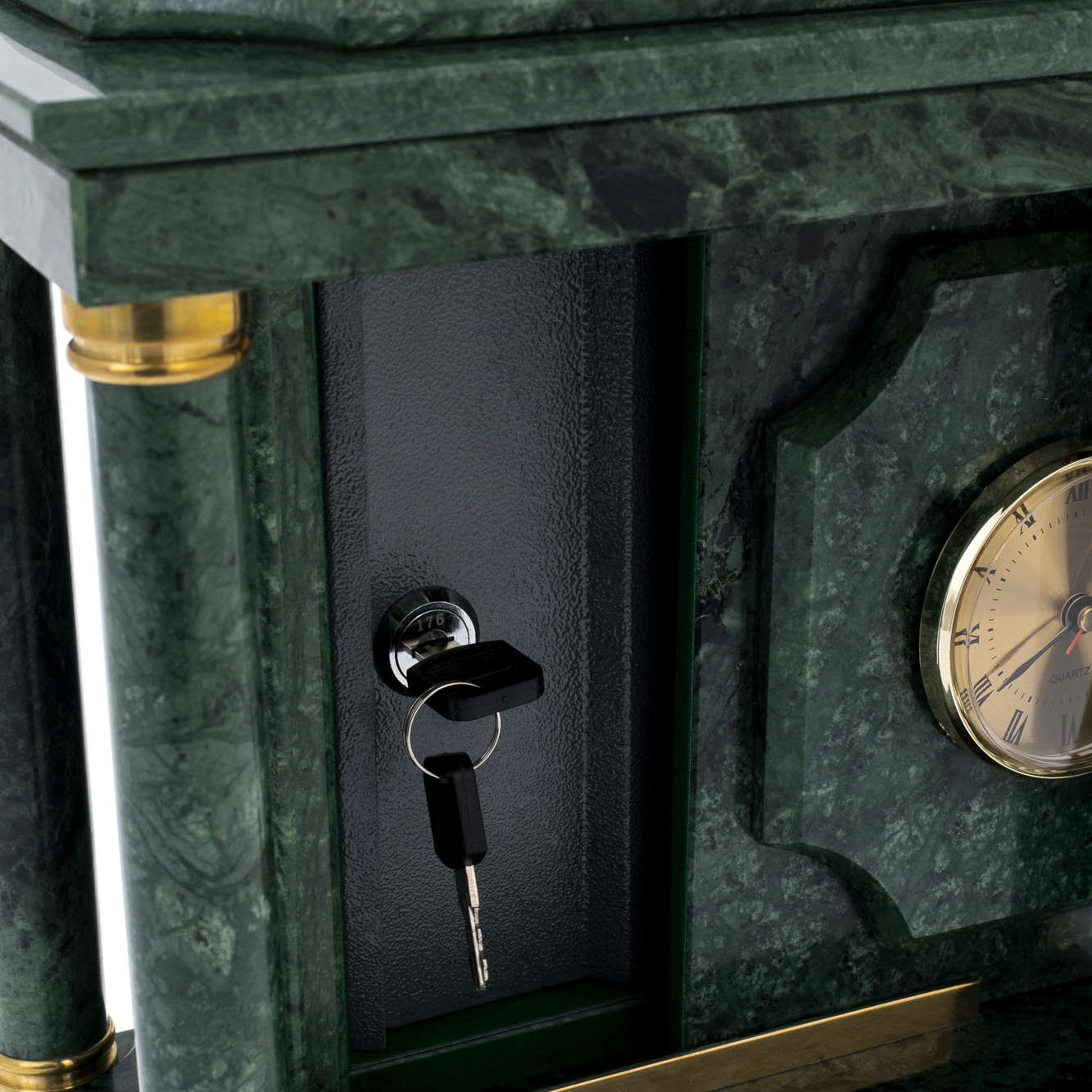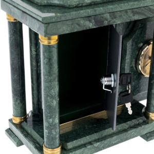 Внутри корпуса скрыт миниатюрный сейф, открывающийся ключом: этот внутренний отсек предназначен для хранения документов, ювелирных украшений или небольших личных ценностей. Механизм тщательно вмонтирован, и его наличие не нарушает визуальной целостности изделия — наоборот, добавляет ощущение тайны и уверенности. Отделка колонн и углов поддержана аккуратными латунными вставками, формирующими золотые акценты на фоне зеленого мрамора. Контраст холодного камня и теплого металла создаёт чувство сбалансированной силы, где каждая деталь имеет своё место и смысл.