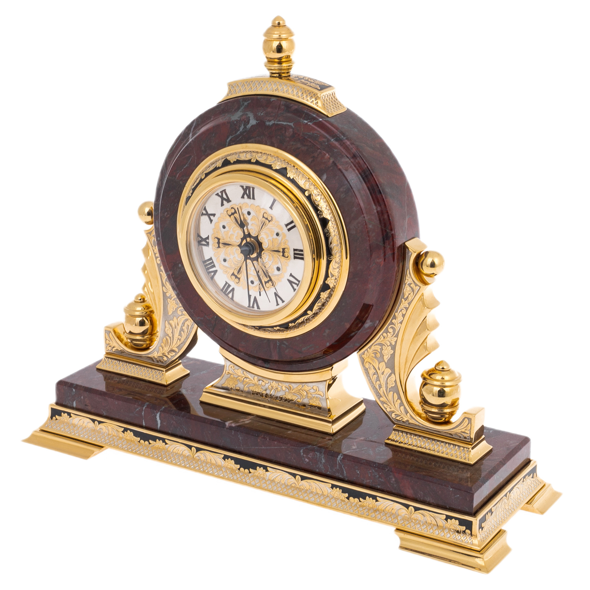 Эти каминные часы из яшмы — истинное произведение искусства, созданное для тех, кто ценит не только точность времени, но и его художественное выражение. Часы выполнены в классическом стиле, где каждая деталь продумана до мелочей. Корпус изготовлен из натуральной яшмы, которая отличается глубоким красно-коричневым оттенком с тонкими вкраплениями чёрного цвета, придающими ему неповторимый характер. Надёжная основа из металла, покрытого золотом, обеспечивает прочность и элегантность внешнего вида.