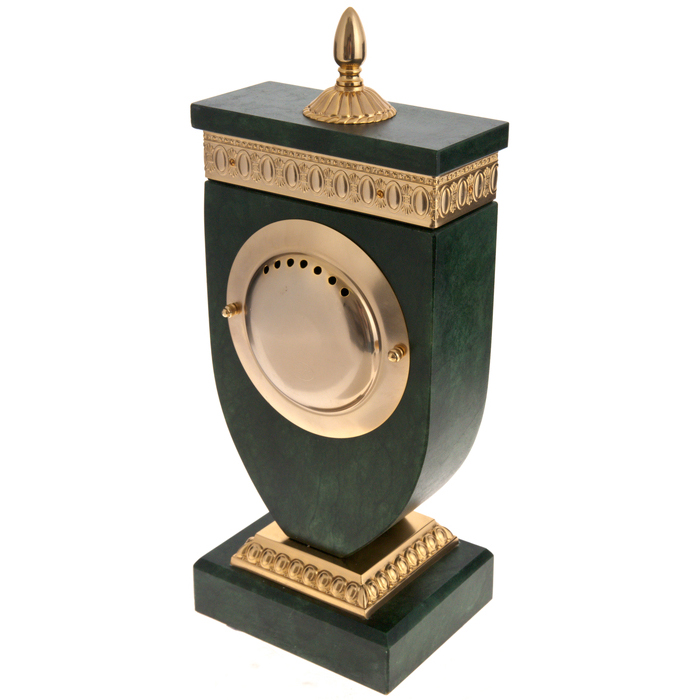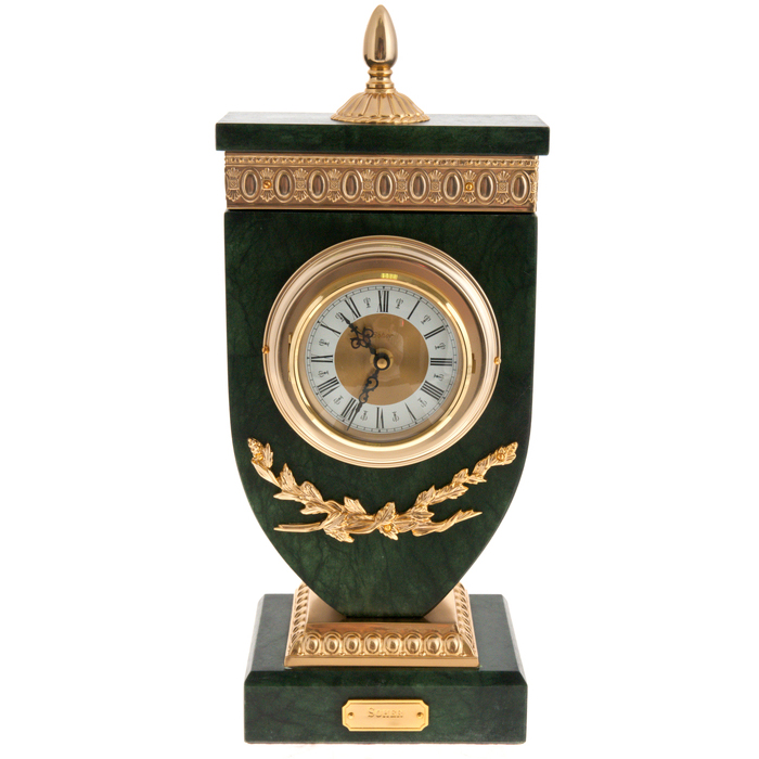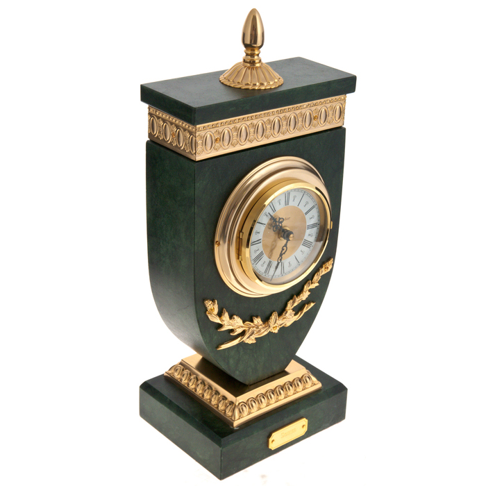 The watch case is made of alabaster, a natural fine-grained gypsum mineral. Outwardly similar to a stone, it is softer and more transparent than the latter. Due to its qualities, alabaster is an indispensable material in decorative art. Even in ancient Egypt, it was used to make vessels for storing incense oils. The case of the watch is elaborately decorated with a relief ornament made of bronze.