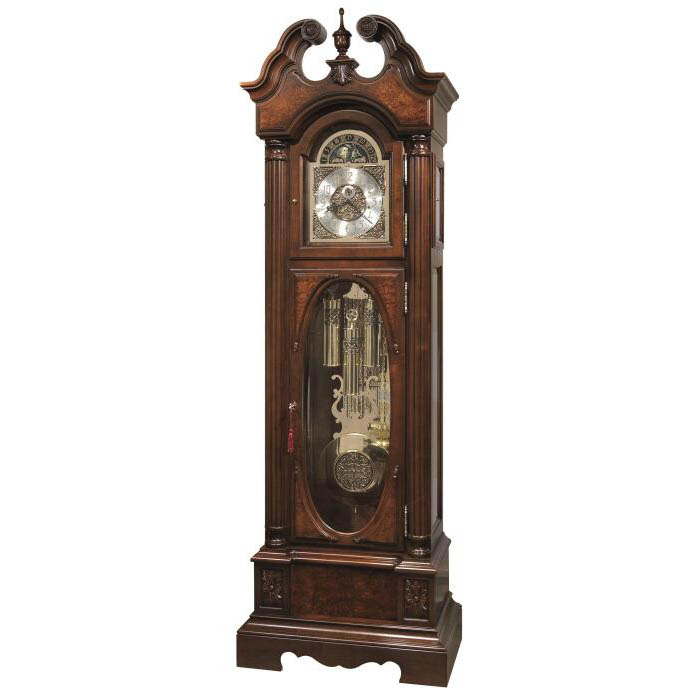 Howard MillerFloor clock "Stratford"Floor clock "Stratford"This solid floor clock is decorated with a pronounced stepped pediment in the form of "swan necks", finished with olive ash veneer with overlays, an artfully chiseled finial, decorative carved rosettes and applications in the form of shells and climbing vines.