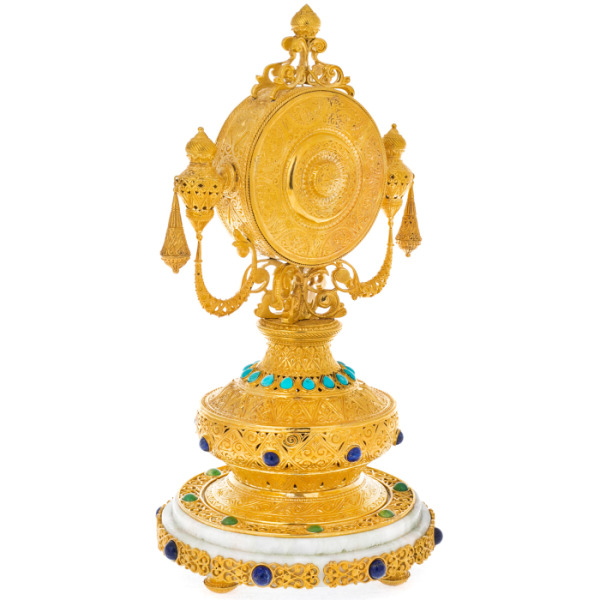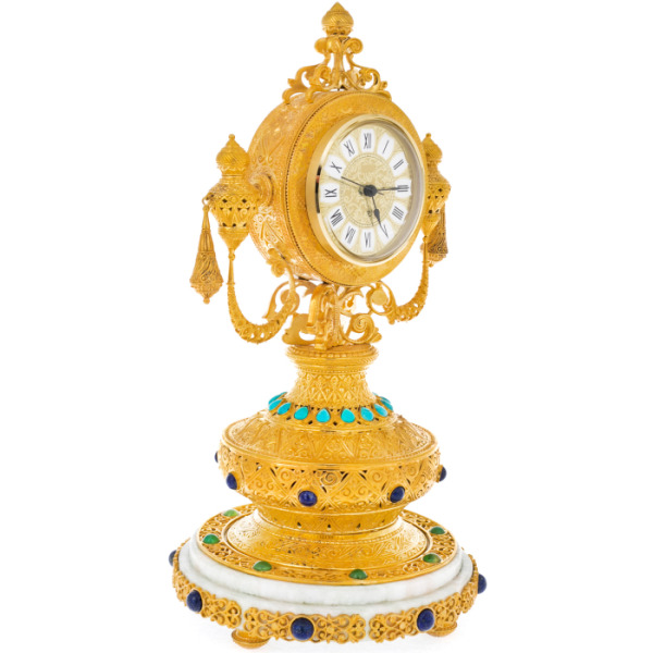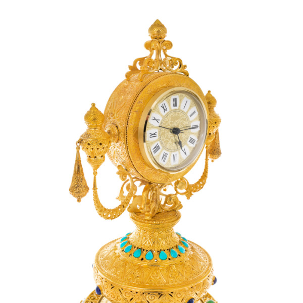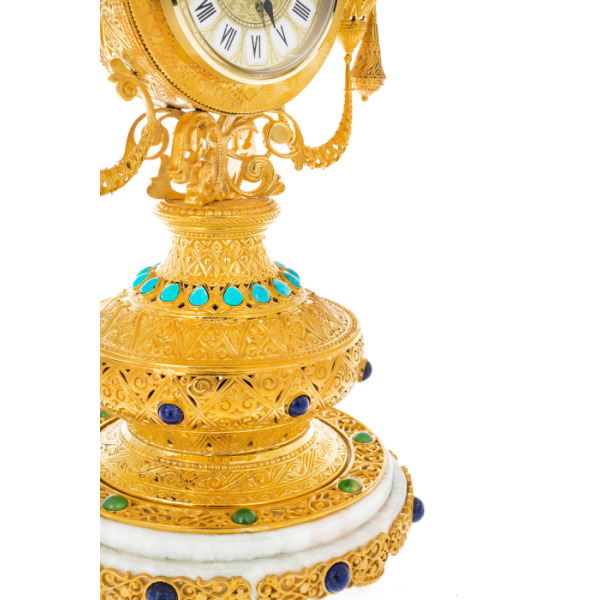 The magnificent Oriental watch is a jewel of craftsmanship and expresses the eternal beauty of oriental art and craft craftsmanship. Decorated in the style of the Zlatoust engraving, this watch shines with a golden sheen, complemented by bright inclusions of turquoise and lapis lazuli, as well as an elegant base, which gives them a special appeal.