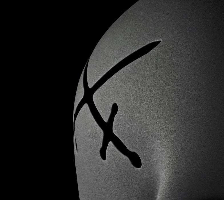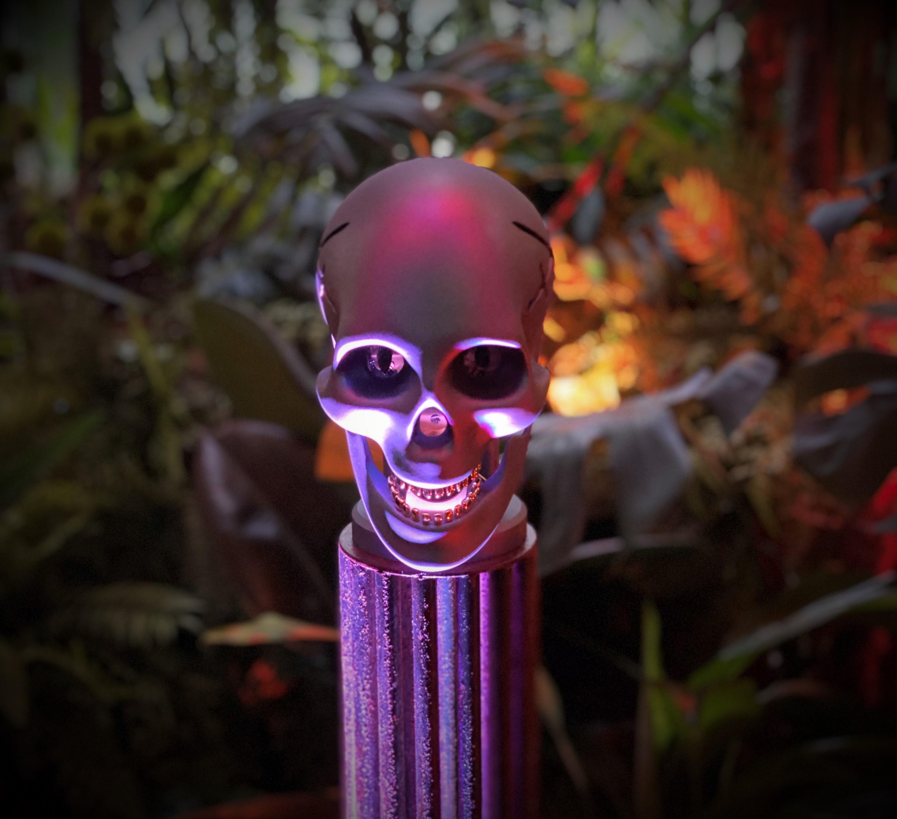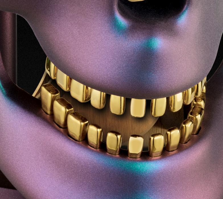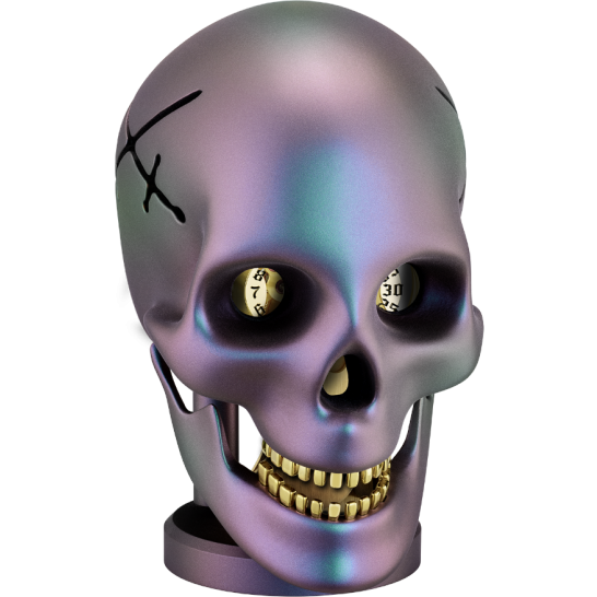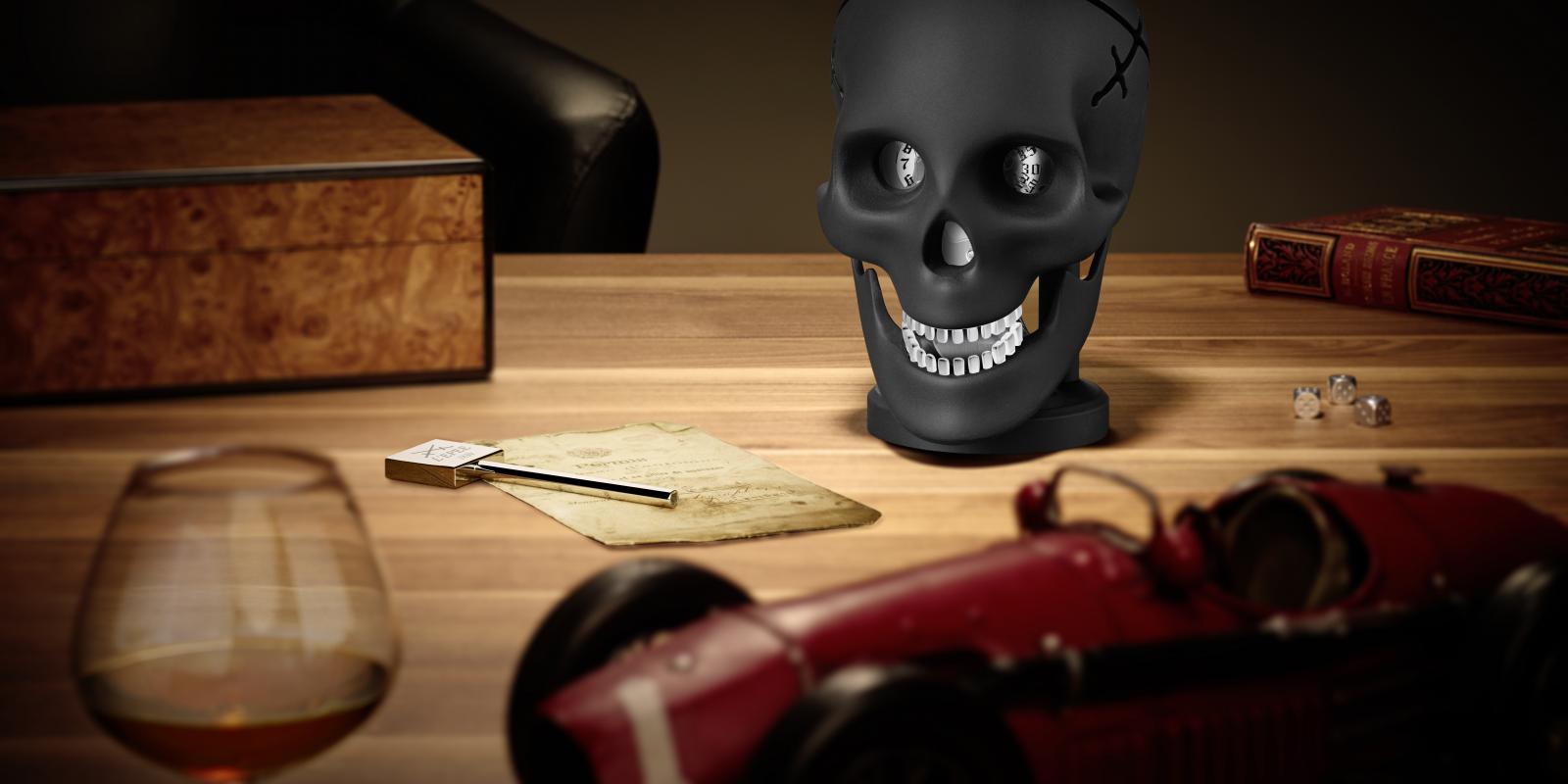Materials:Skull: Machined cast aluminum, mechanism: brass and stainless steel, gold plated