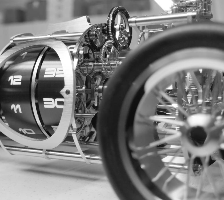 Materials:nickel-plated and palladium brass, stainless steel, blown glass dome, aluminum front and rear body parts, stainless steel spoke discs, tires made of wear-resistant rubber.