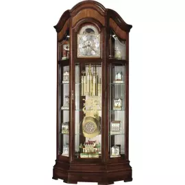Howard Miller Grandfather clock "Majestic II" Grandfather clock "Majestic II" This impressive showcase clock from the Broadmoor Collection is decorated with an arched pediment, equipped with glass shelves and finished with olive ash veneer. Specially designed dial design, exquisite overhead corners and a lunar calendar. The patterns on the dial are also repeated on brass weights and a pendulum. The glazing of the body and doors is made using faceted crystal glass. All six shelves are designed for items from your collections. Three shelves can be installed at any height of the display case behind the moving pendulum. Kieninger mechanism, cable suspension of weights, three melodies, automatic night shutdown of melody and fight. Mirrored glasses built into the back wall of the showcase give a presentable look to your collections. The case is made of selected hardwoods and partially covered with veneer. The tinting and polishing of the case are made in the color of Windsor Cherry.