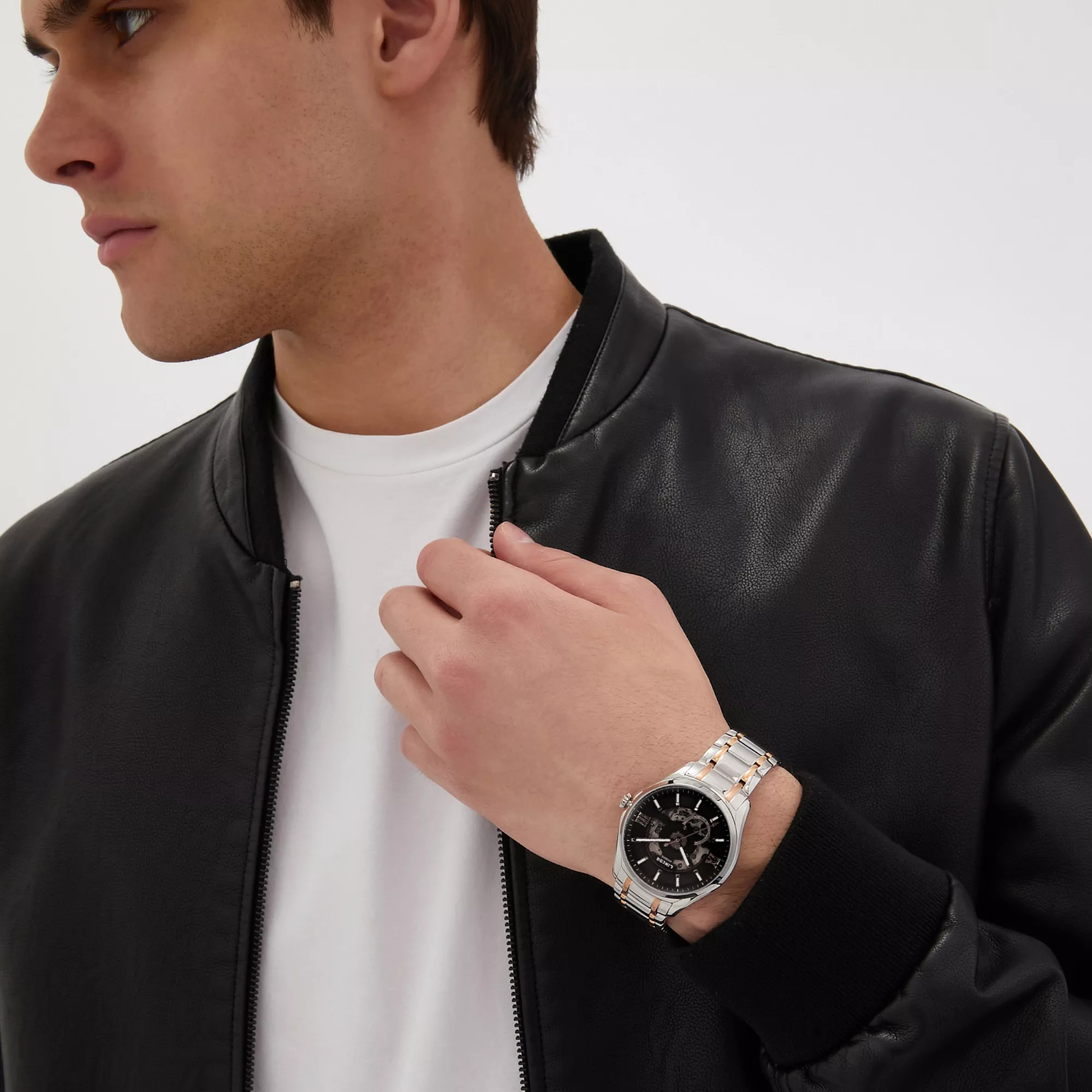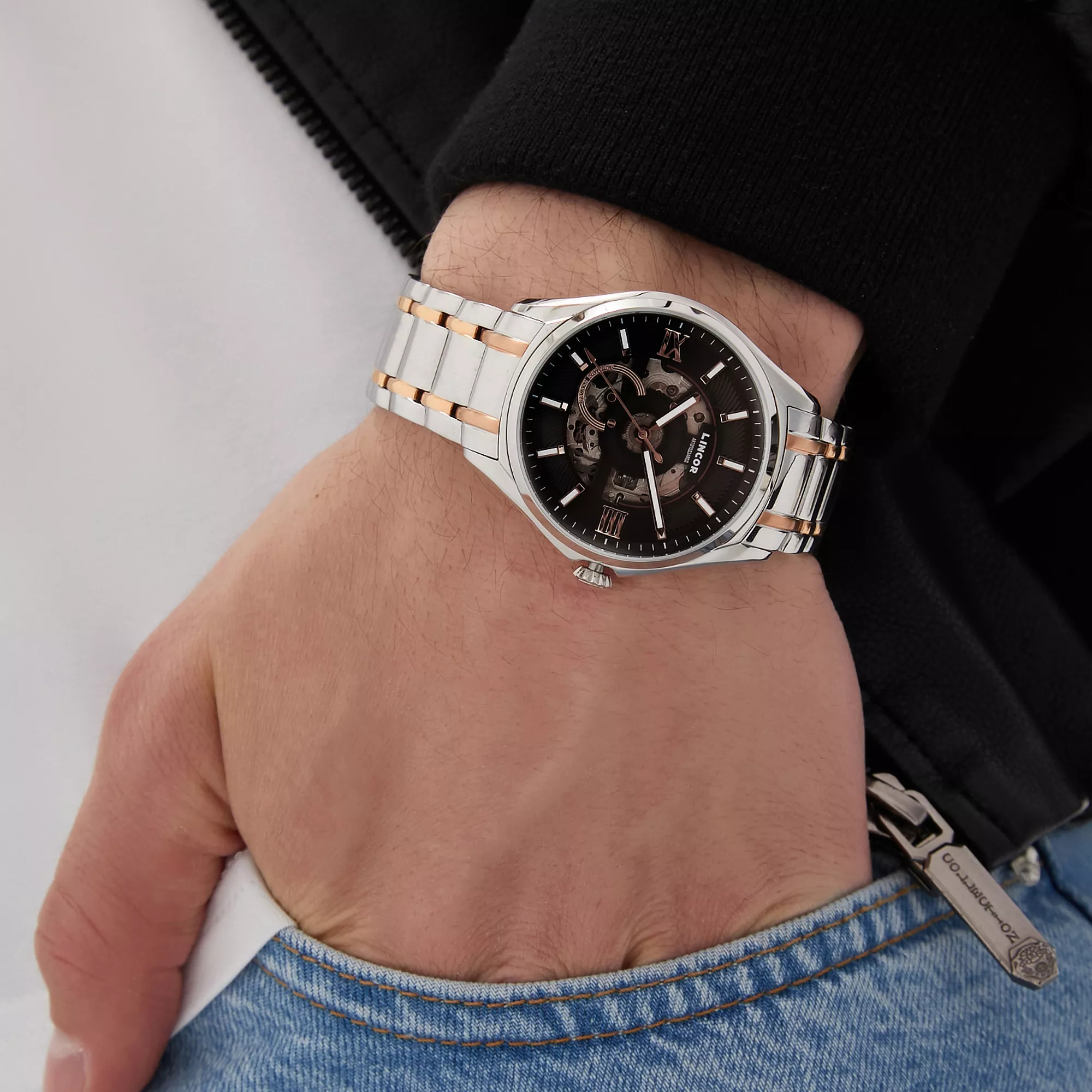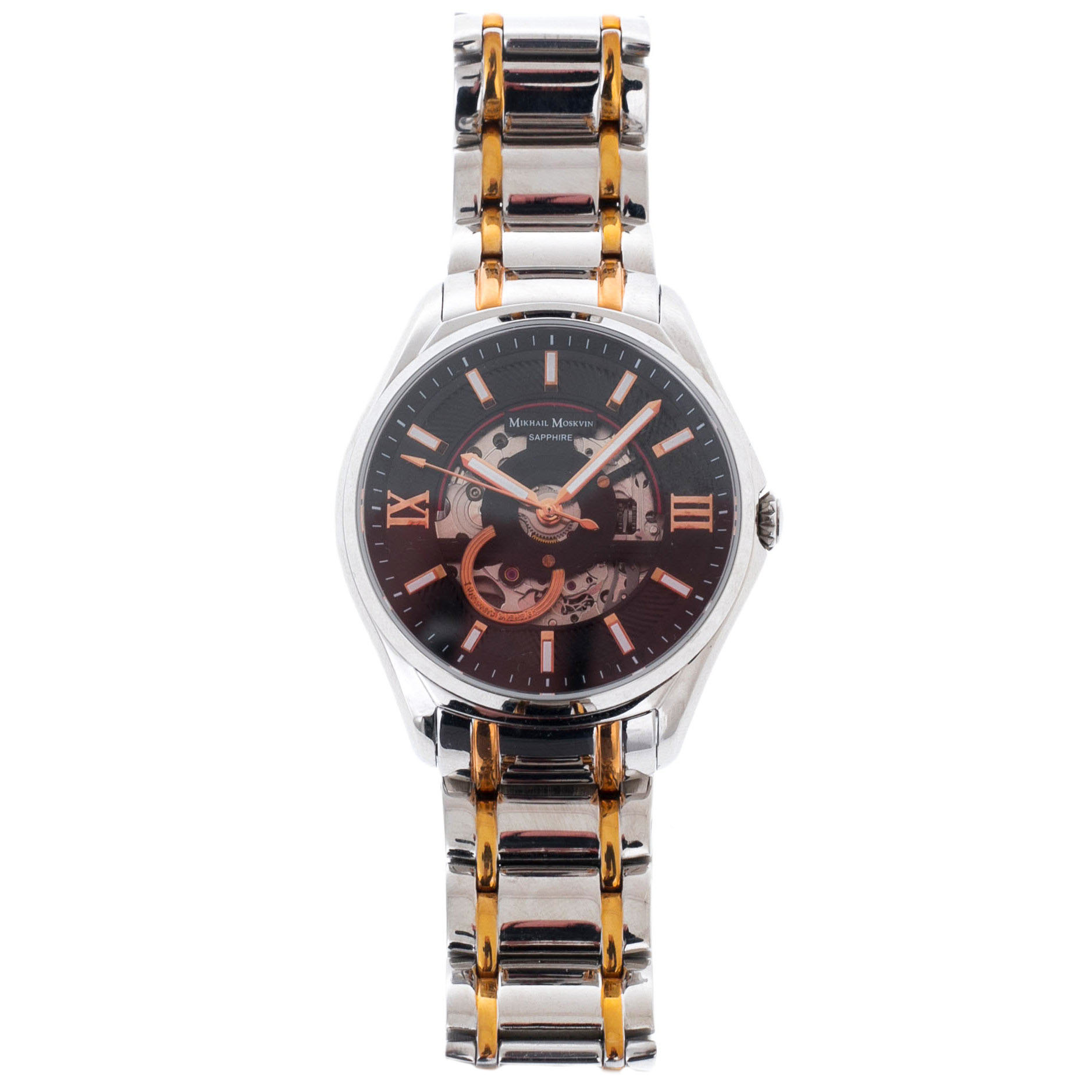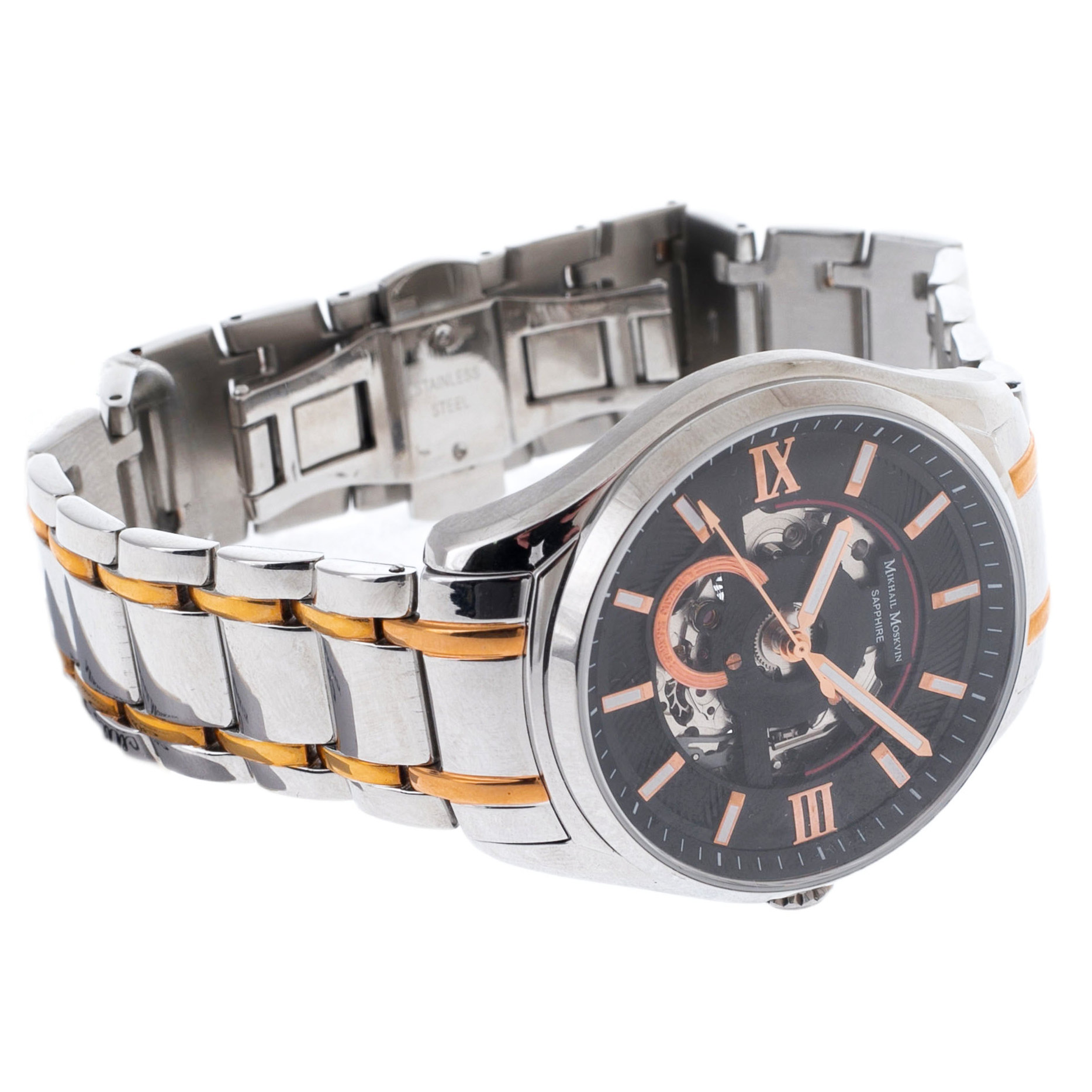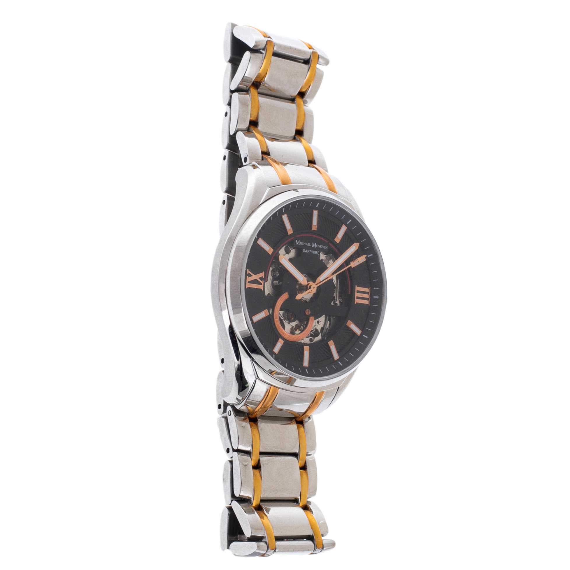 Men's mechanical self-winding watches. The central hour, minute and second hands. Black skeletonized dial. The round case is made of stainless steel. The diameter of the case is 41 mm, the thickness is 12 mm. A steel bracelet with a partial yellow gold coating, a folding clasp. Scratch-resistant sapphire crystal. Water resistance WR 50