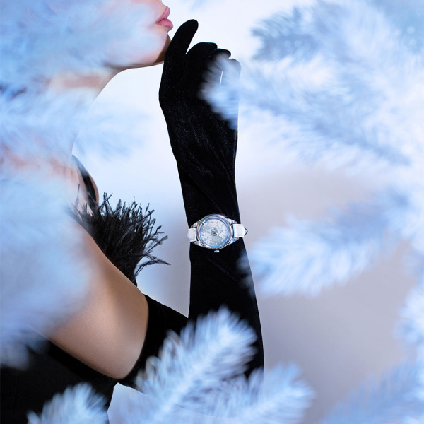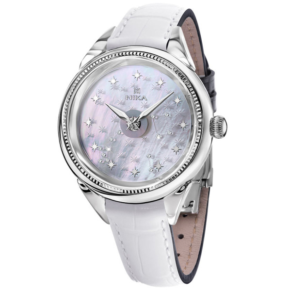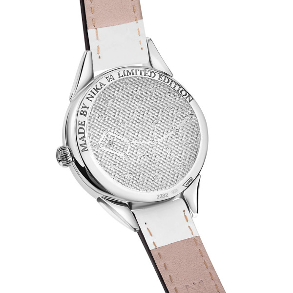 The 925 sterling silver case with a rhodium coating retains a noble shine and protects against darkening. The dial has a transparent disk with diamond constellations of the Big and Little Bear rotating in the course of movement. The watch's ears are decorated with iridescent enamel with the effect of the northern lights. The strap is made of thick leather with stitching and is completed by a butterfly clasp with a branded pattern. The cover of the watch is decorated with an engraving of the constellation Ursa Minor and the star NIKA on the background of the starry sky.