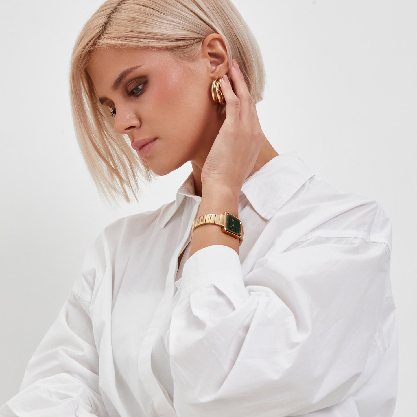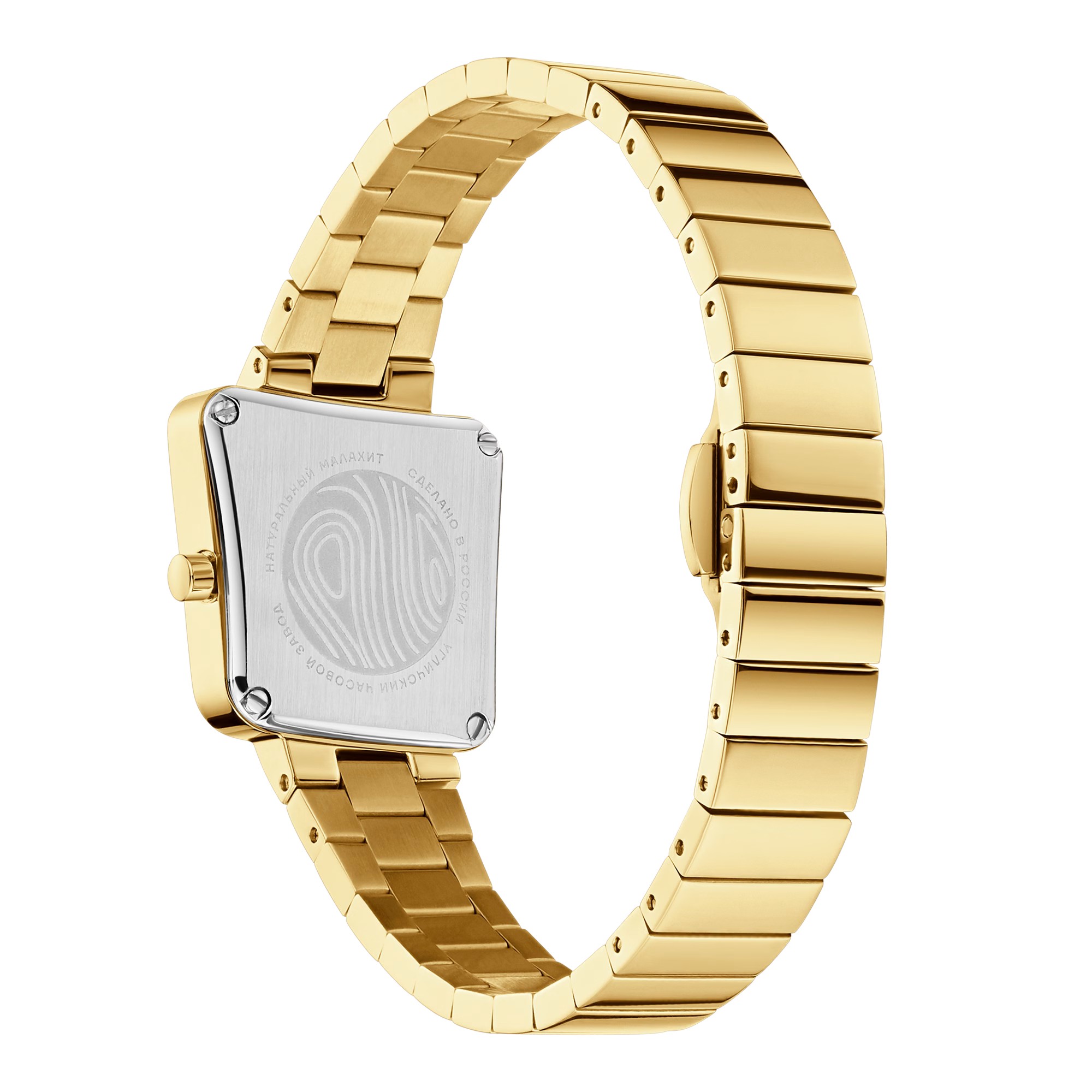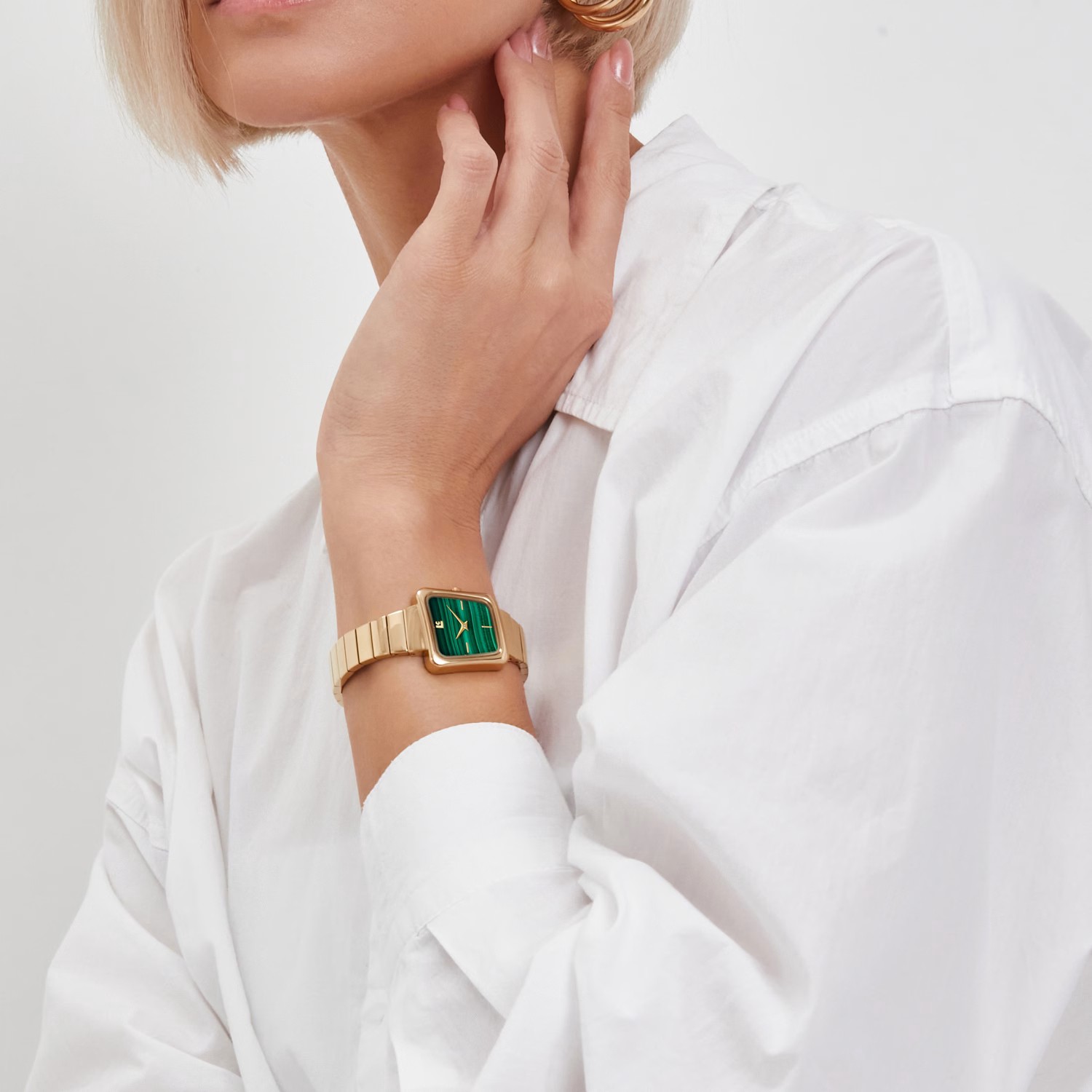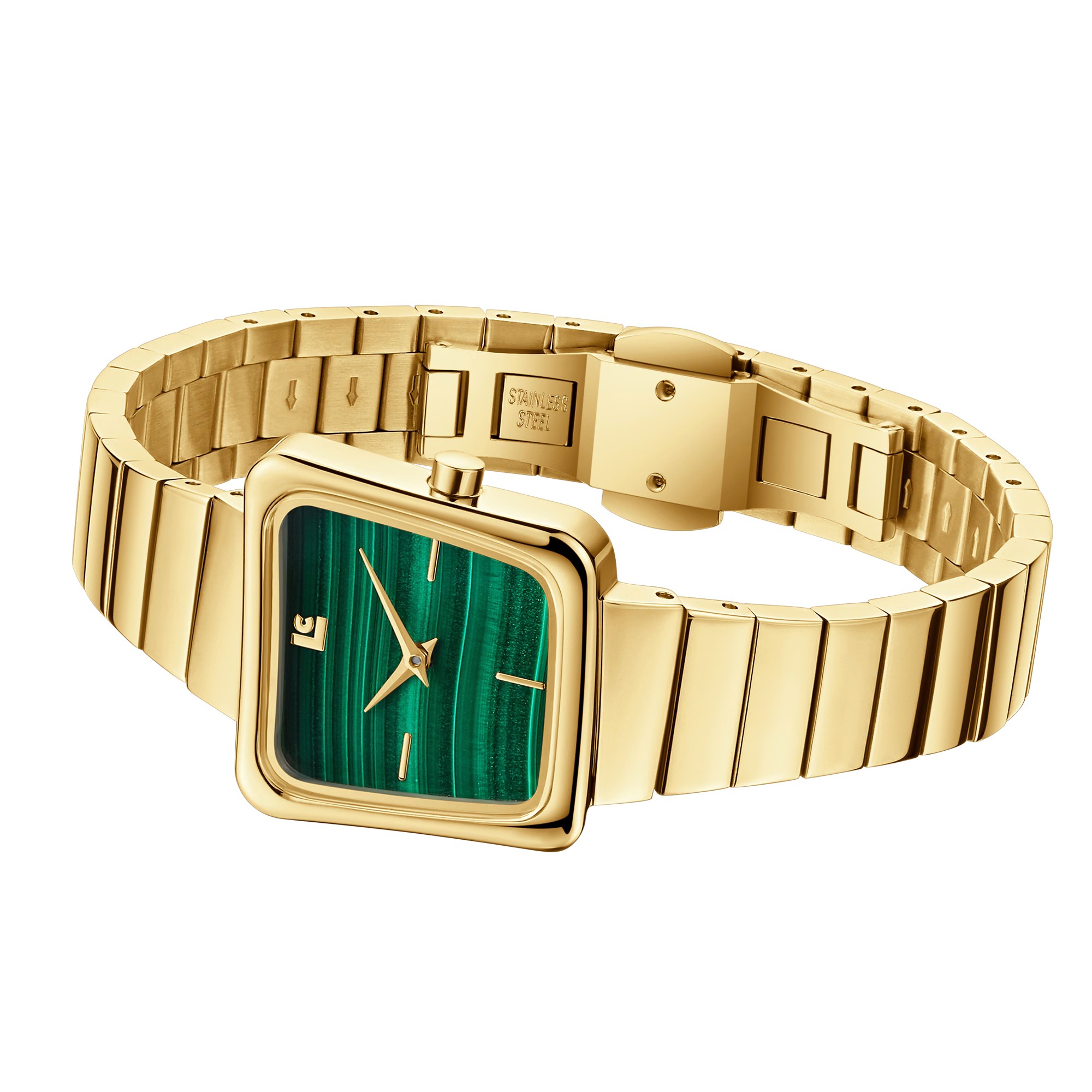 Изысканные часы с циферблатом из натурального малахита - настоящая симфония элегантности с нотами винтажа. Необычная форма глянцевого ассиметричного корпуса идеально сочетается с классическим браслетом, звенья которого повторяют геометрию узора малахитового циферблата.