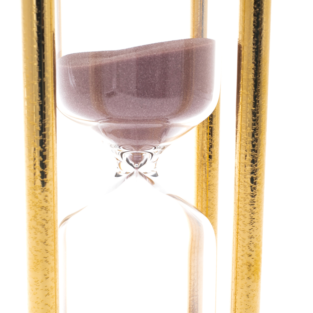 The flask of transparent glass seems to contain magic: the pinkish sand slowly crumbles, reminding of the fragility of moments and the importance of each of them. The supporting columns shine under the rays of light like golden jets encircling the space-time stream, creating the illusion that these clocks can stop the passage of time for at least a moment.