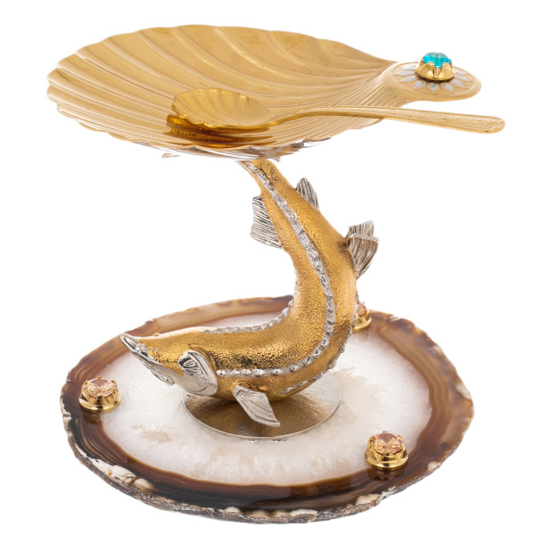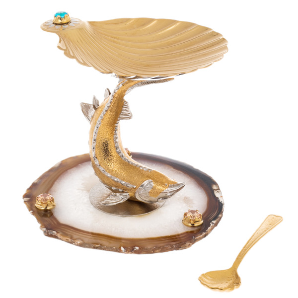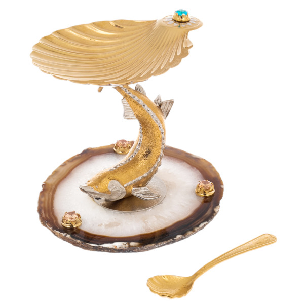 The shell crowning the sculpture serves as a bowl for caviar. Its golden surface is in harmony with the decorative spoon in the shape of a miniature shell, completing the ensemble. The decoration is decorated with shining inserts of crystals — one of which is mounted on the edge of the sink, several more accentuate the composition on the agate stand, emphasizing the brilliance and solemnity of the product.