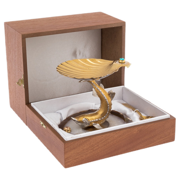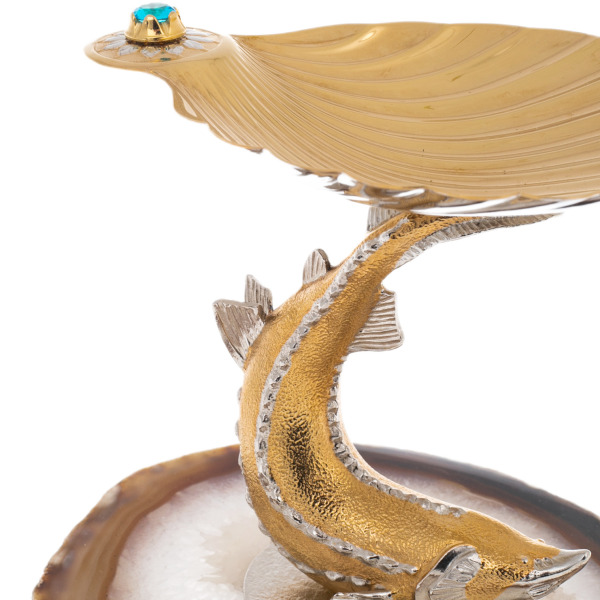 The Beluga caviar bowl on agate is a work of Ural craftsmen, in which rare natural materials are combined with filigree handwork. The base is a slice of agate, showing the natural pattern of the stone and the radiance of the crystal center. The figure of a beluga stands on it, made of metal with an exquisite combination of gilding and silvering. Each curve of the fish's body is carefully worked out, and the characteristic texture of the scales gives the composition vivid expressiveness.