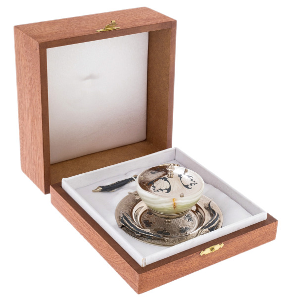 The onyx caviar bowl "3 sturgeon" is the epitome of refined luxury and a symbol of power, created for those who appreciate true art and high position. This caviar bowl is a perfect combination of the natural beauty of onyx and the craftsmanship of Zlatoust artisans. Every element — from the graceful shapes of the sturgeon to the rich texture of the stone — testifies to your impeccable taste and commitment to perfection.