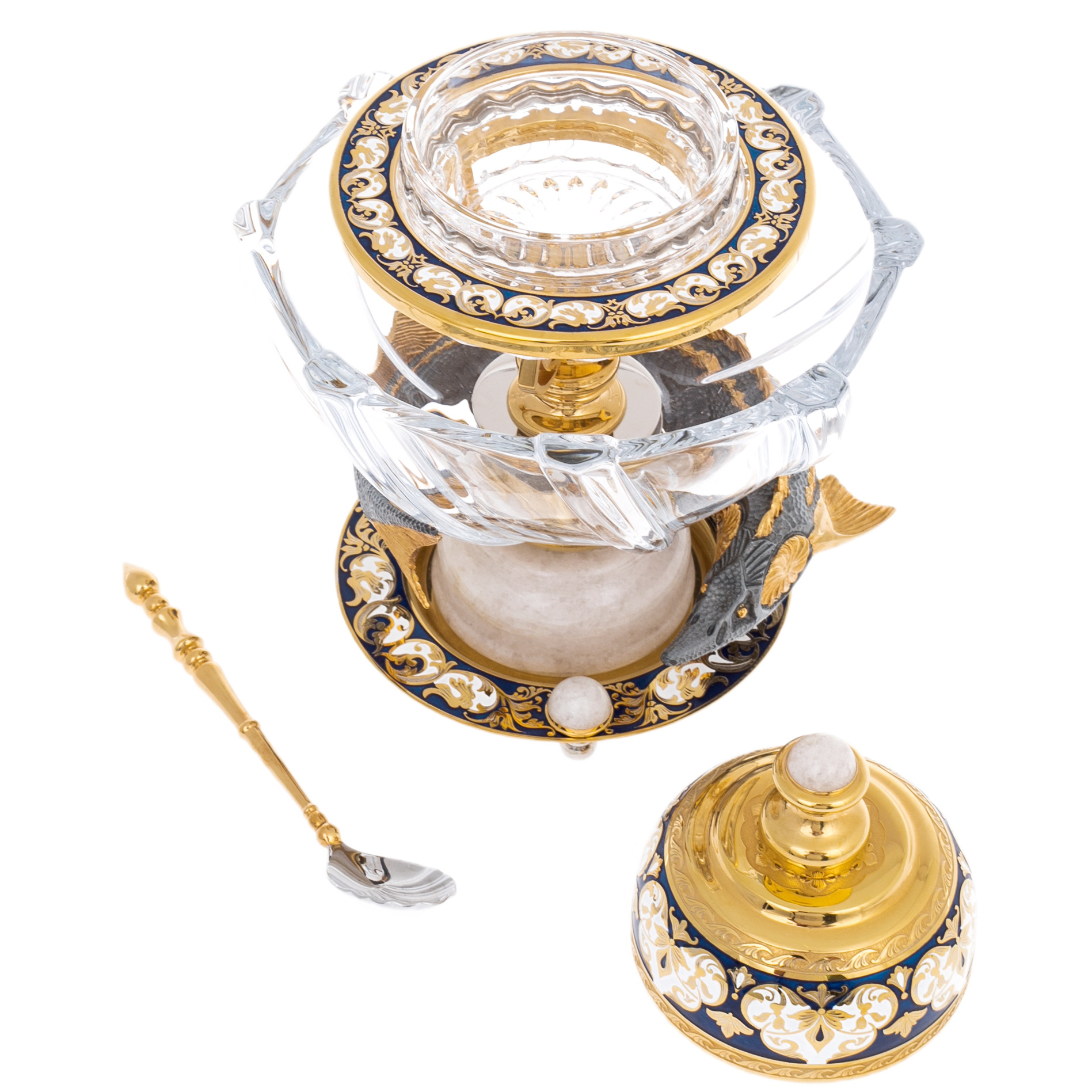 Икорница "Посейдон" выполнена на льдистом кварце, который придает изделию особую привлекательность и долговечность. Этот природный камень, обладая удивительными прозрачностью и твердостью, символизирует чистоту и благородство. Каждая деталь украшенной вручную икорницы отражает тщательность работы и внимание к мелочам. Изящная роспись, утонченные линии и декоративные элементы создают неповторимую гармонию, достойную королевского стола.