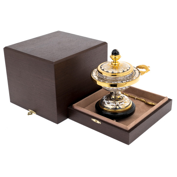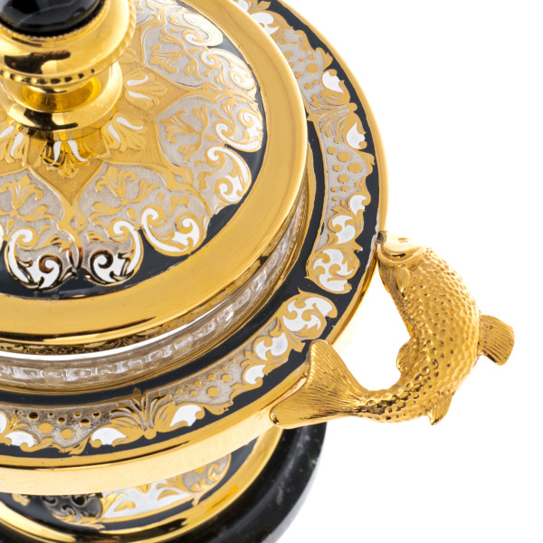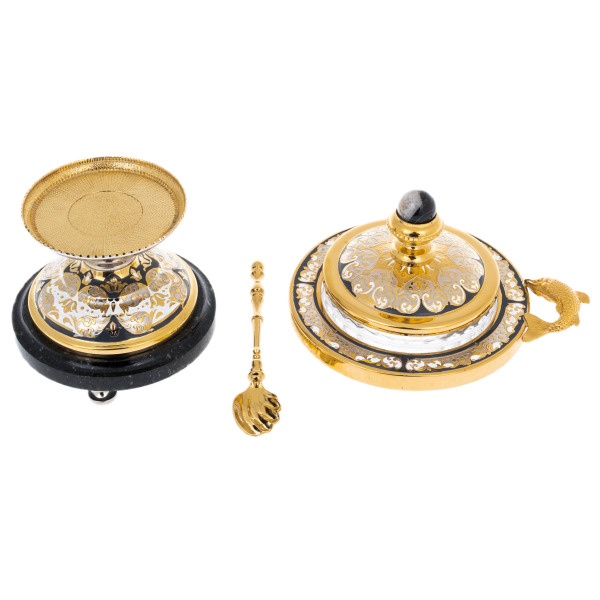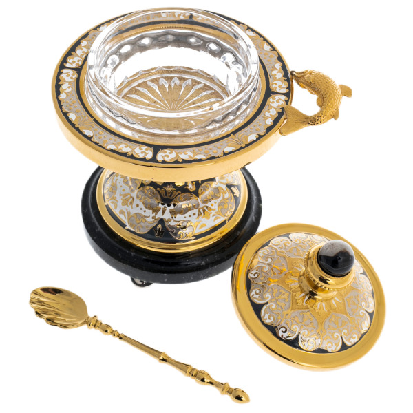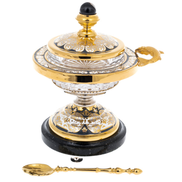 The Chrysostom caviar bowl is made in the format of a small tabletop object that combines fine art casting, filigree engraving and transparent crystal into a single composition. The crystal clear bowl, the sides of which play with light, is inserted into a massive golden rim with blackening, decorated with floral ornaments. The lid repeats the aesthetics of the base: a dense layer of gilding, the finest curls, a black cabochon stone in the top and a miniature handle in the form of a sturgeon, made with amazing precision. On a dolerite stand, deeply polished to a mirror, there is a decorative leg with a dense ornament that builds a vertical balance of the entire structure. The ensemble is rounded off by a spoon decorated with a painted cup and relief elements.