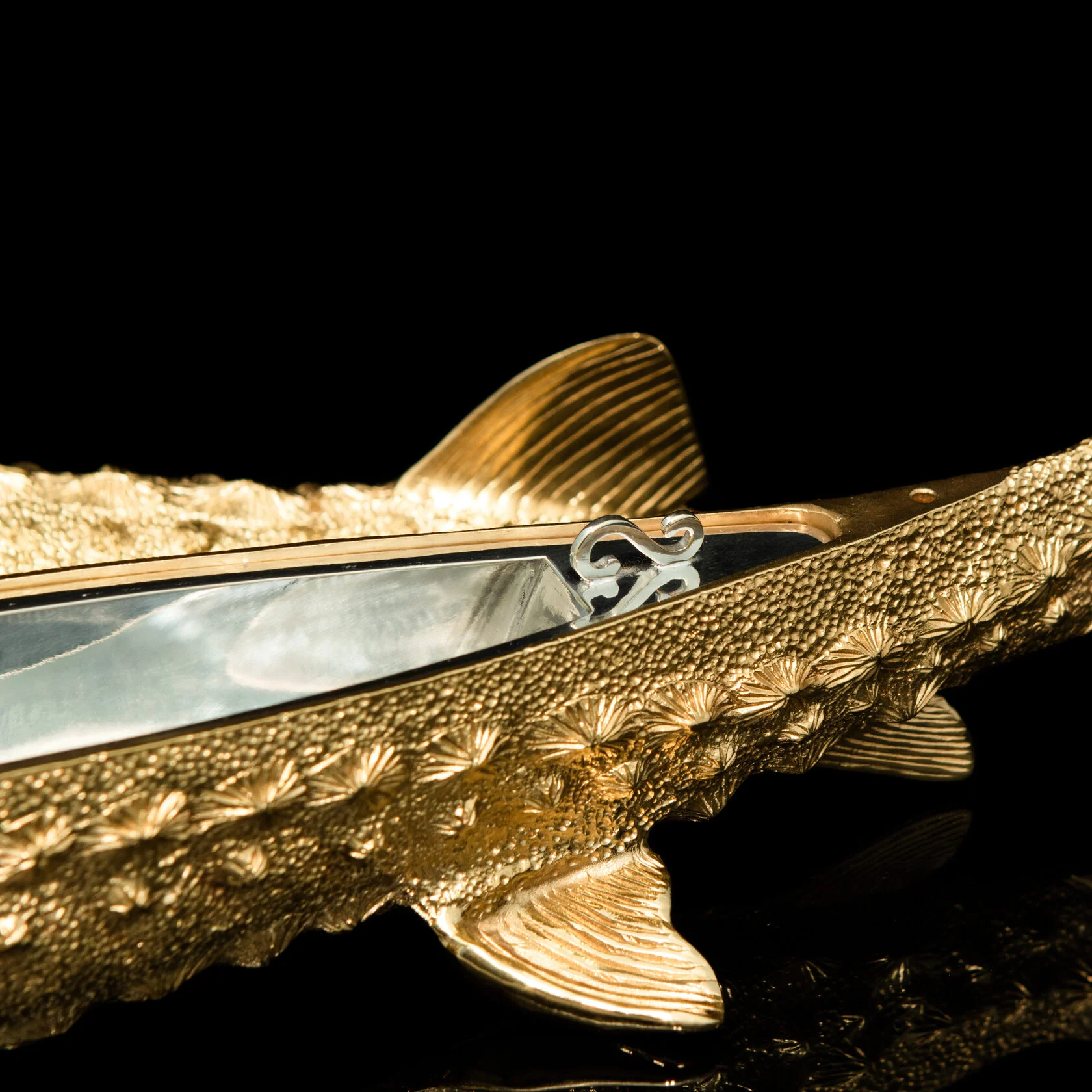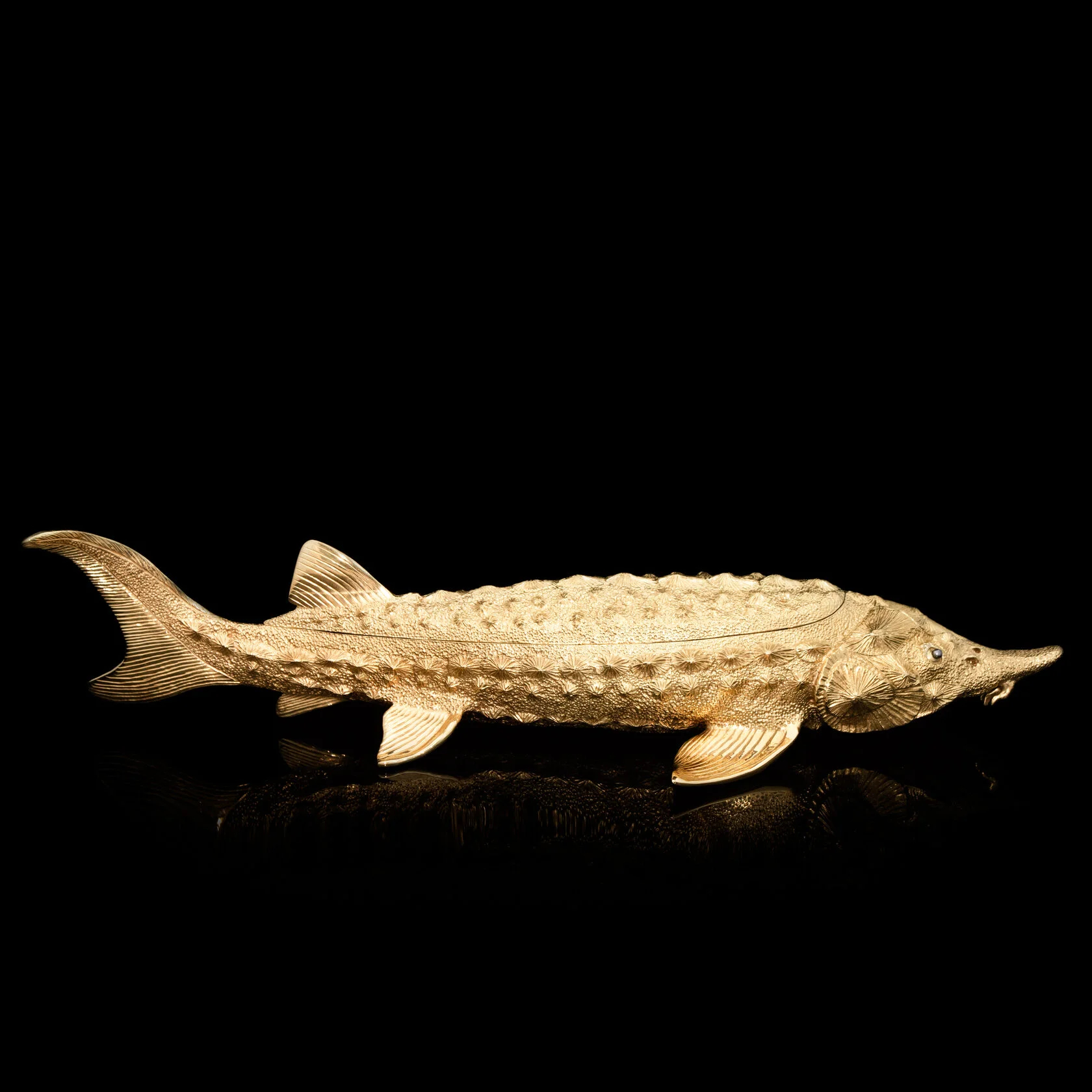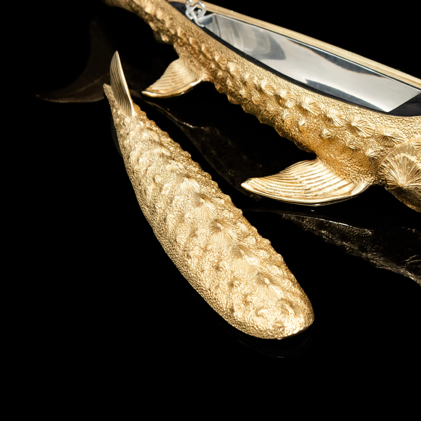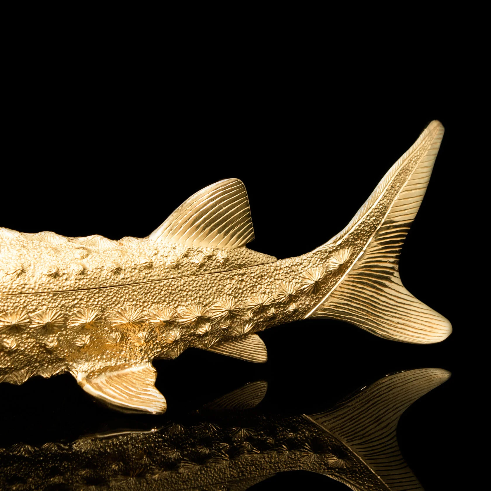 The original Sturgeon caviar bowl made of brass, completely covered with 24-carat gold, is a true work of art inspired by the masterpieces of the outstanding Russian jeweler Carl Faberge. In this exquisite product, as in a fairy tale, the image of the famous Russian sturgeon comes to life, embodying royalty and nobility. Every curve and every detail seems to breathe history, immersing in an atmosphere of luxury and sophistication unique to a select few.