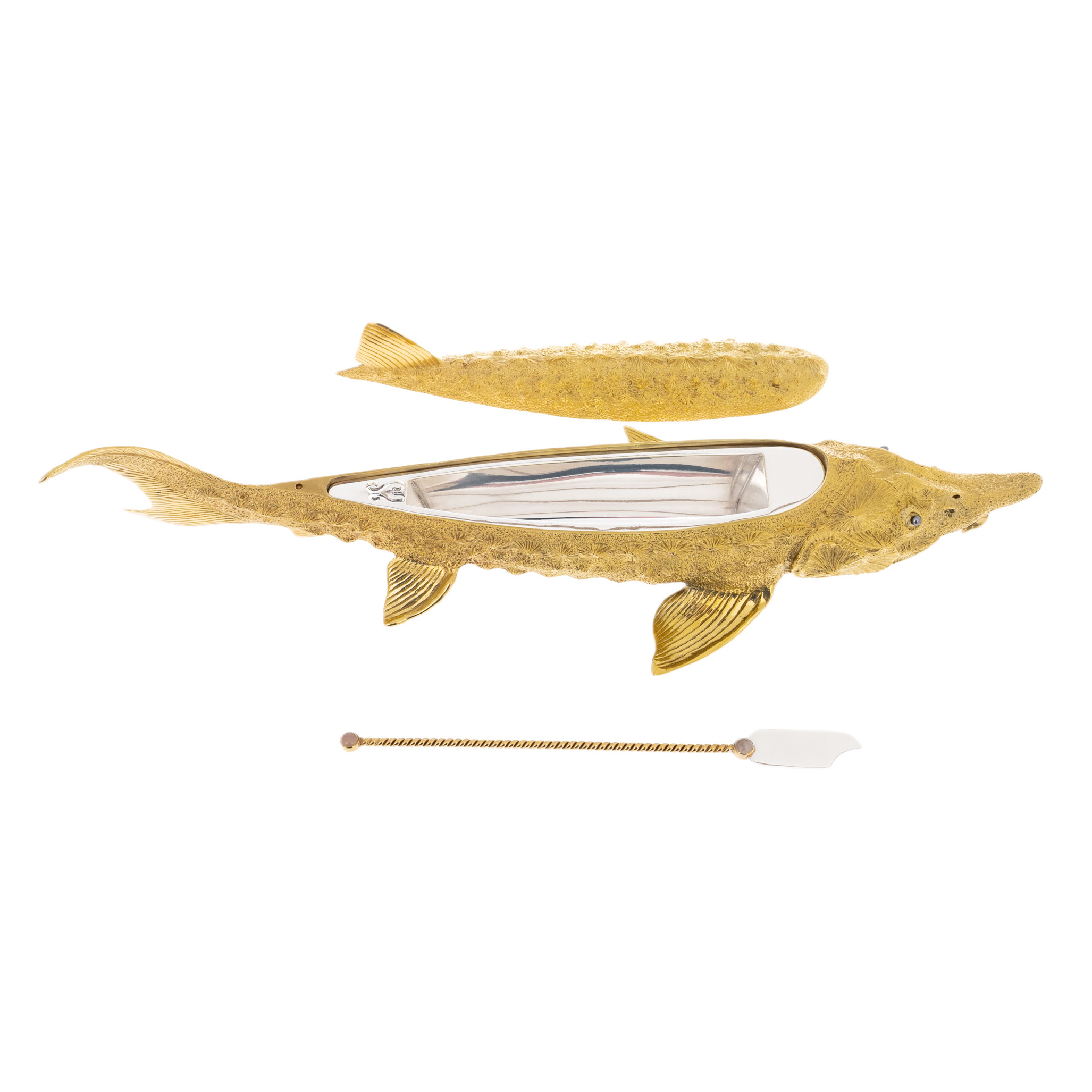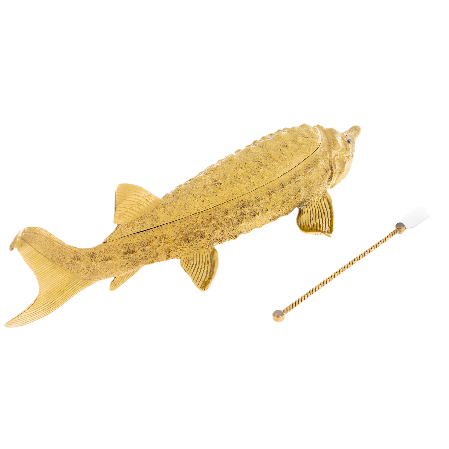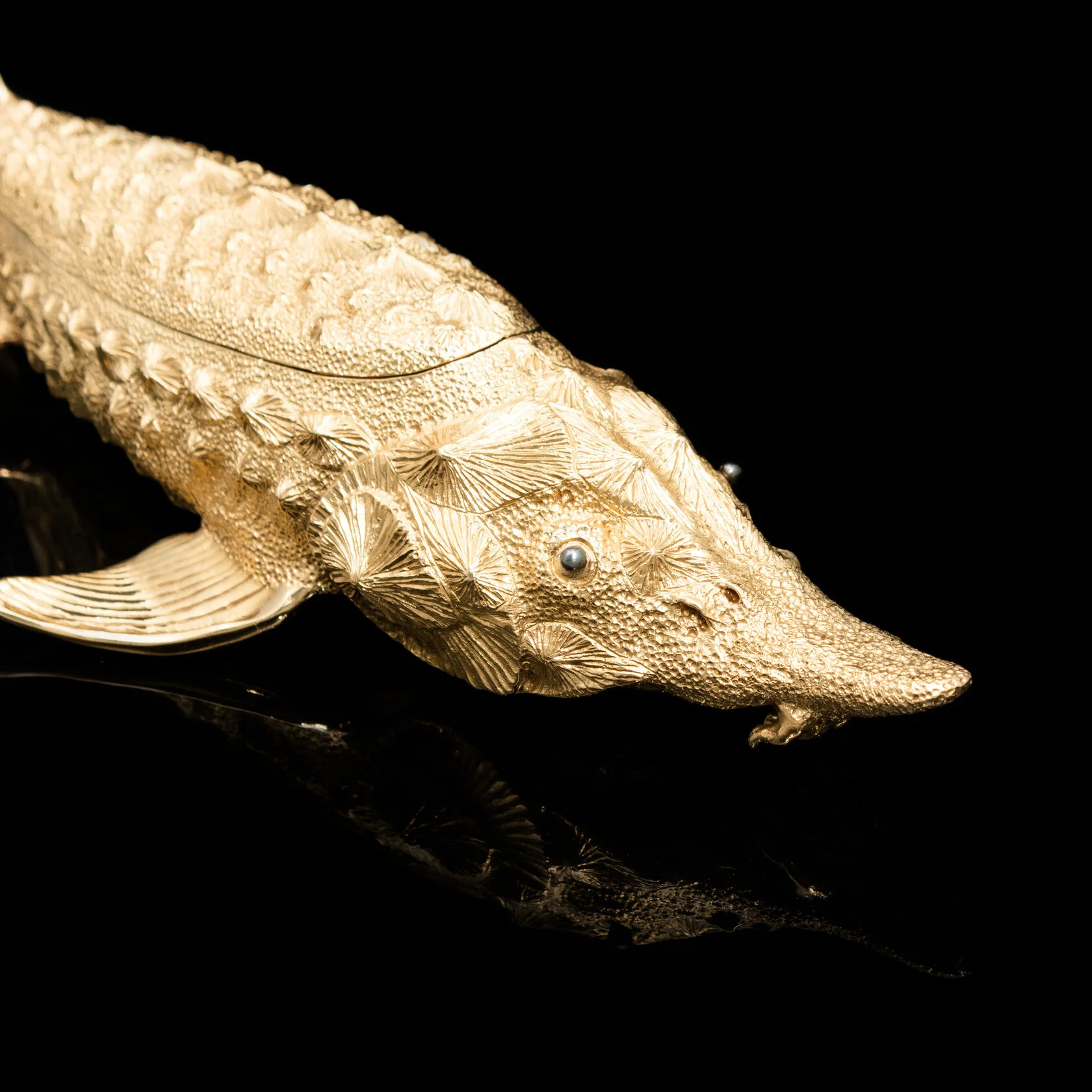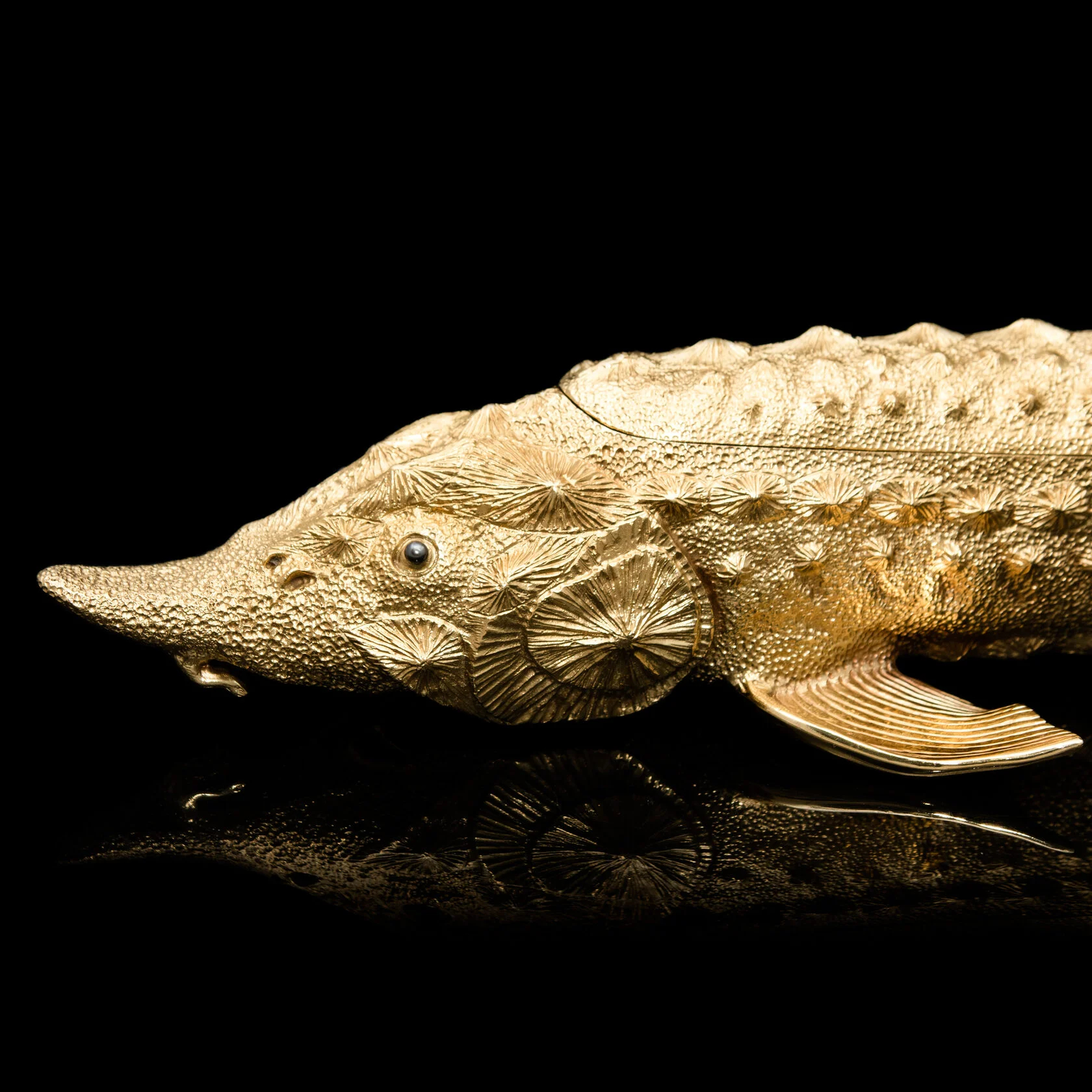 The original Sturgeon caviar bowl made of brass, completely covered with 24-carat gold, is a true work of art inspired by the masterpieces of the outstanding Russian jeweler Carl Faberge. In this exquisite product, as in a fairy tale, the image of the famous Russian sturgeon comes to life, embodying royalty and nobility. Every curve and every detail seems to breathe history, immersing in an atmosphere of luxury and sophistication unique to a select few.