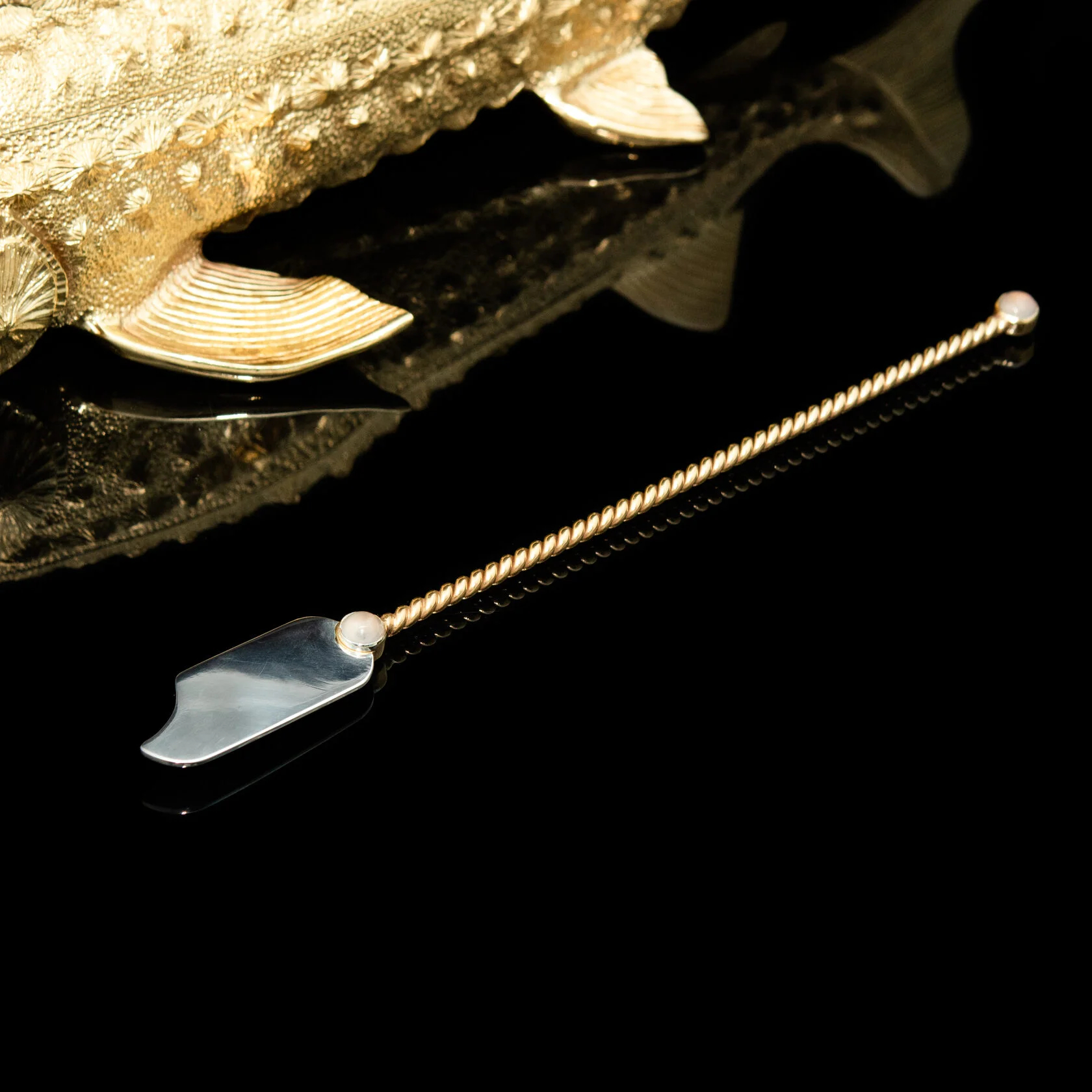 Elegant inserts of black pearls, located in the eyes of the sturgeon, give the work a special depth and mystery. These precious elements, like stars in the night sky, sparkle and shimmer, adding a touch of mystery and elegance. Every look at the caviar brings up associations with the depths of the sea, where black pearls, as a rare gift of nature, carefully preserve the secrets and riches of the ocean.
