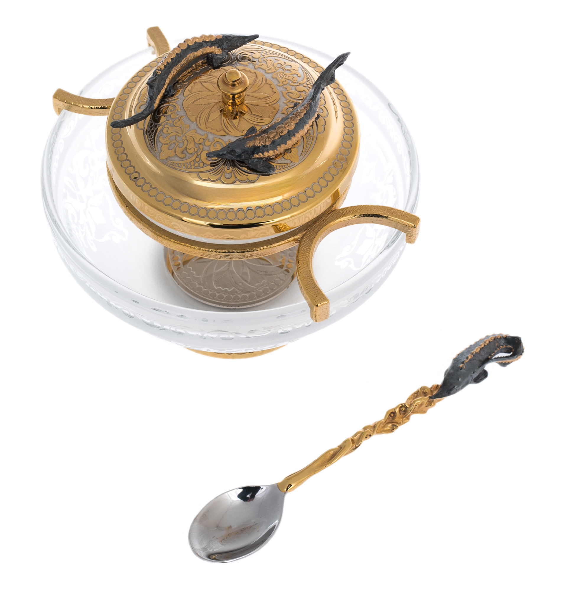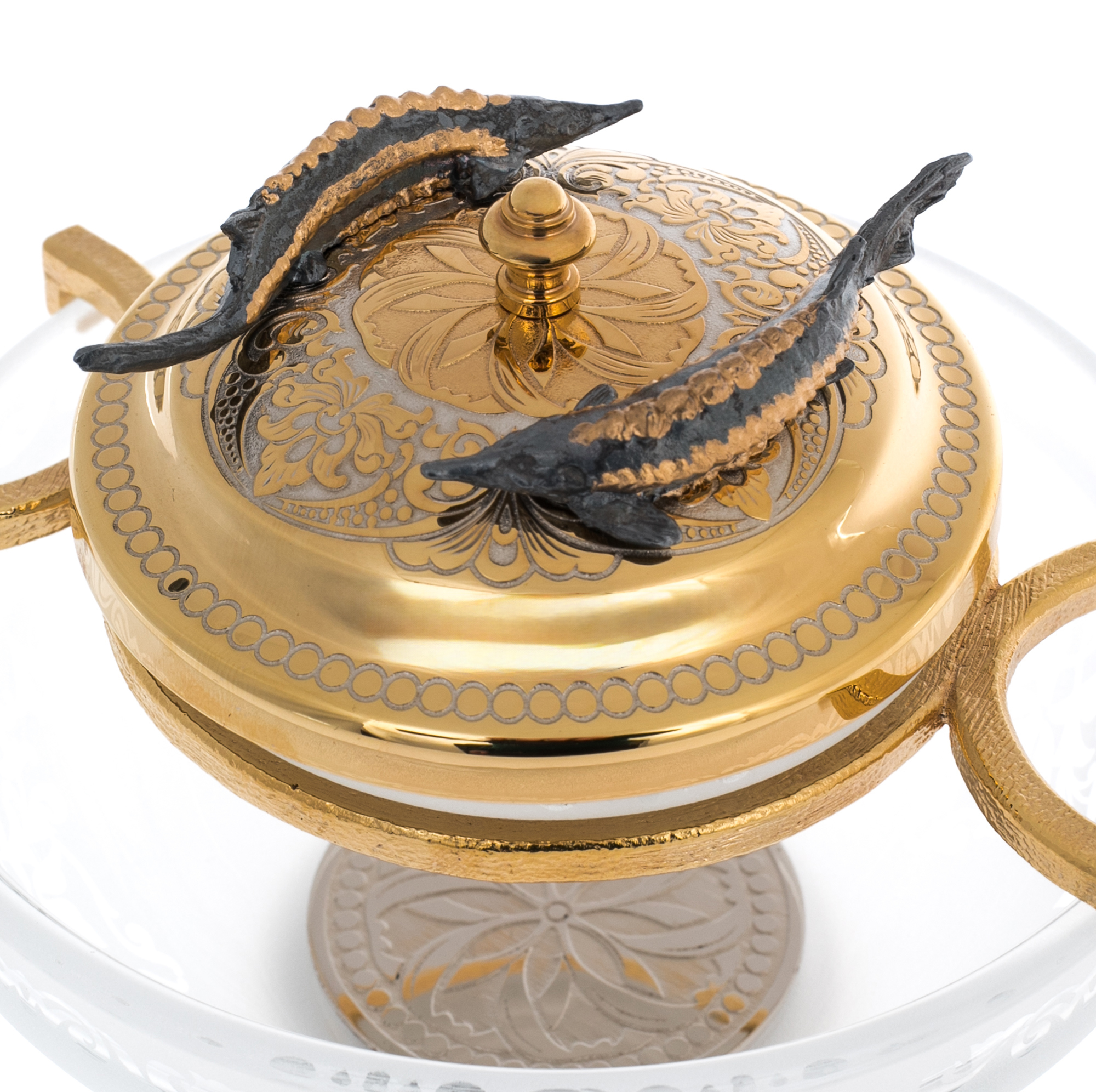 Икорница «Осетровая» с ложечкой из Златоуста — изысканный атрибут роскоши, созданный специально для истинных ценителей тонкого вкуса и эстетической красоты в сервировке. Сочетание прозрачного хрусталя, блестящей латуни и художественной обработки металла превращает этот предмет в символ статуса и достатка. Крышку икорницы венчают две искусно выполненные фигуры осетров, покрытые родием и золотом, подчёркивающие престиж и эксклюзивность изделия. Позолоченная ложечка с тонкой отделкой повторяет мотив осетра, дополняя комплект и подчёркивая благородный вкус своего владельца.