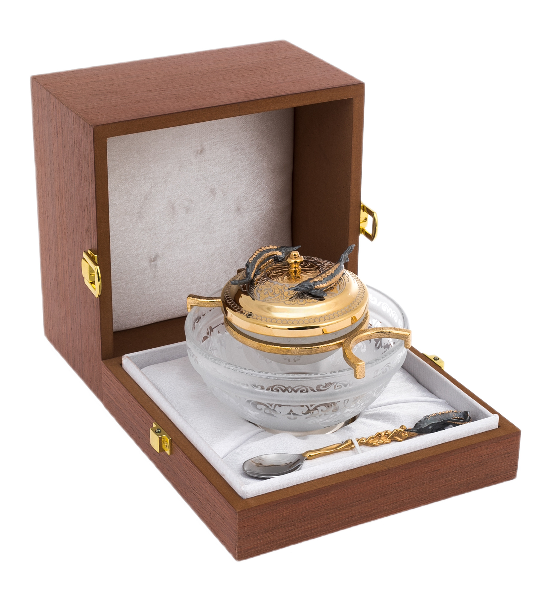 Художественное оформление икорницы с ложечкой завораживает красотой и гармонией форм. Осетры, олицетворяющие изобилие и успех, элегантно расположены на резной крышке, выполненной в виде ажурного цветочного орнамента. Чаша из чистейшего хрусталя с нежной матовой гравировкой покоится на устойчивом позолоченном основании. Ложечка, утончённо декорированная и прекрасно лежащая в руке, завершает композицию и делает её идеальным подарком для тех, кто привык окружать себя предметами исключительного качества и утончённой красоты.