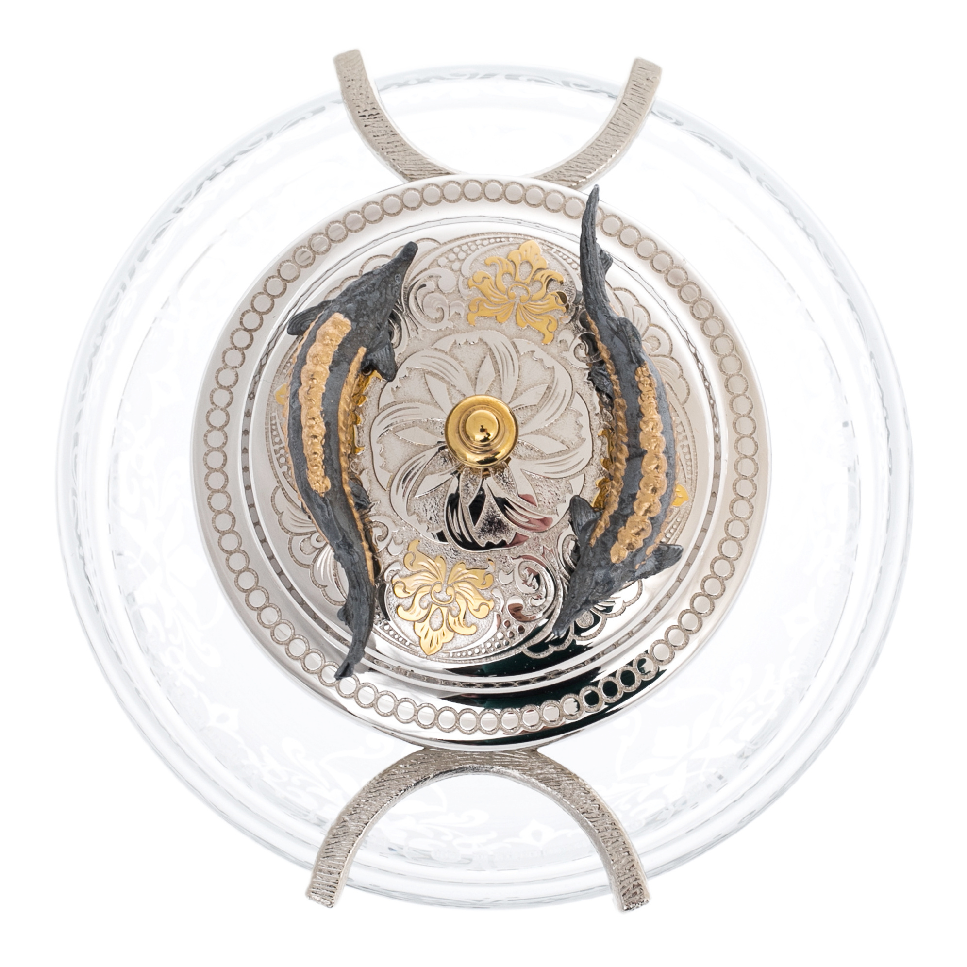 Икорница «Осетровая» с ложечкой из Златоуста — изысканный атрибут роскоши, созданный специально для истинных ценителей тонкого вкуса и эстетической красоты в сервировке. Сочетание прозрачного хрусталя, блестящего никелированного покрытия и художественной обработки металла превращает этот предмет в символ статуса и достатка. Крышку икорницы венчают две искусно выполненные фигуры осетров, покрытые родием и золотом, подчёркивающие престиж и эксклюзивность изделия. Ложечка с никелированным покрытием и тонкой отделкой повторяет мотив осетра, дополняя комплект и подчёркивая благородный вкус своего владельца.