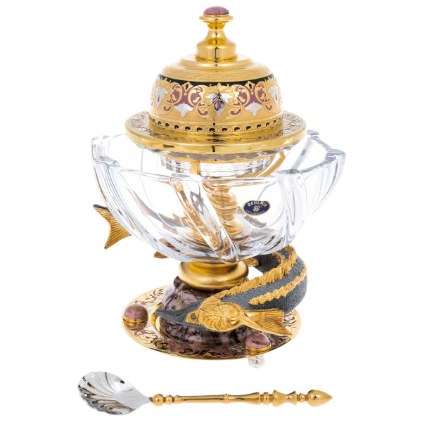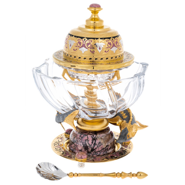 The Poseidon caviar bowl is a ceremonial serving object created in the best traditions of Chrysostom and aimed at connoisseurs of the gastronomic ritual in its highest, almost ceremonial form. The crystal bowl, shining with deep edges, rises above the author's stand made of rhodonite, a stone with an expressive natural structure and a rare pink-black palette. The top ends with a gilded dome decorated with filigree patterns with pink inlays, and the accompanying spoon repeats the overall artistic solution, creating a complete ensemble for serving valuable varieties of caviar.
