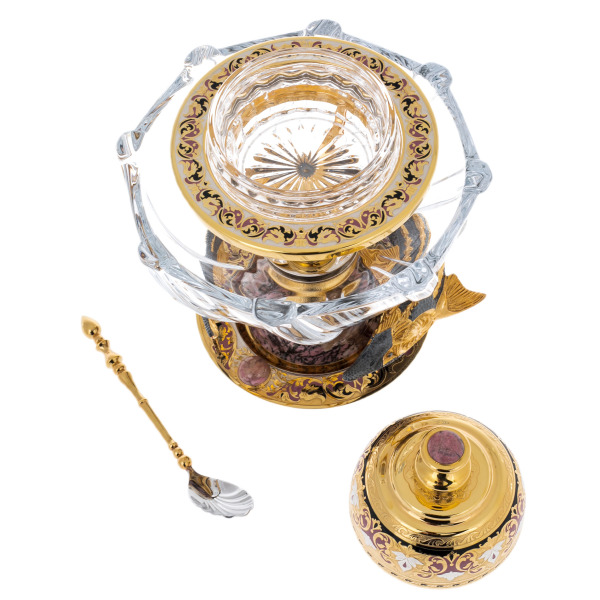 Caviar bowl with ice cream "Poseidon" jasper,enamel, ChrysostomCaviar bowl with ice cream "Poseidon" jasper,enamel, ChrysostomCollections of fine tableware from masters from Zlatoust are spectacularly decorated with painting, etching and gilding. After an elegant pattern is applied to the polished surface, the product is dried in an oven and processed, after which the pattern becomes embossed.