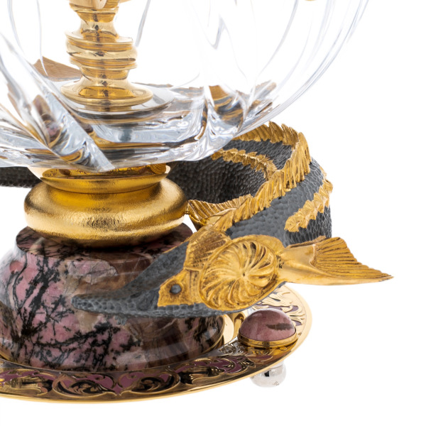 The basis of the composition is formed by relief figures of sturgeons, made in a complex combined technique: the dark texture emphasizes volume and realism, and gold accents highlight key details, giving them a noble shine. A rhodonite pedestal balances the glass bowl, creating an impression of monumentality while maintaining the lightness of the structure. The gilded stand, decorated with pink inserts and delicate ornaments, forms an expressive decorative field, from which a transparent wave of crystal seems to rise.