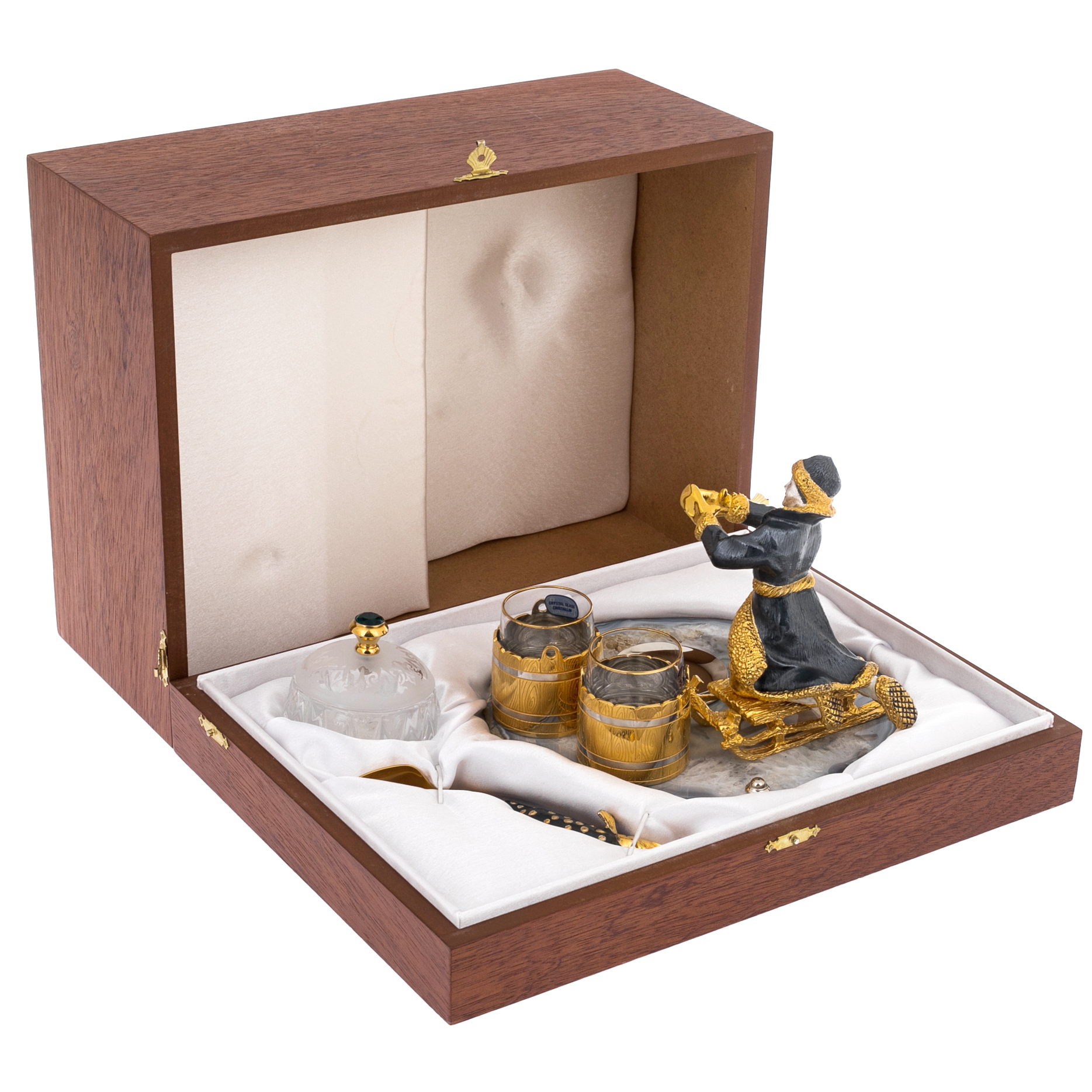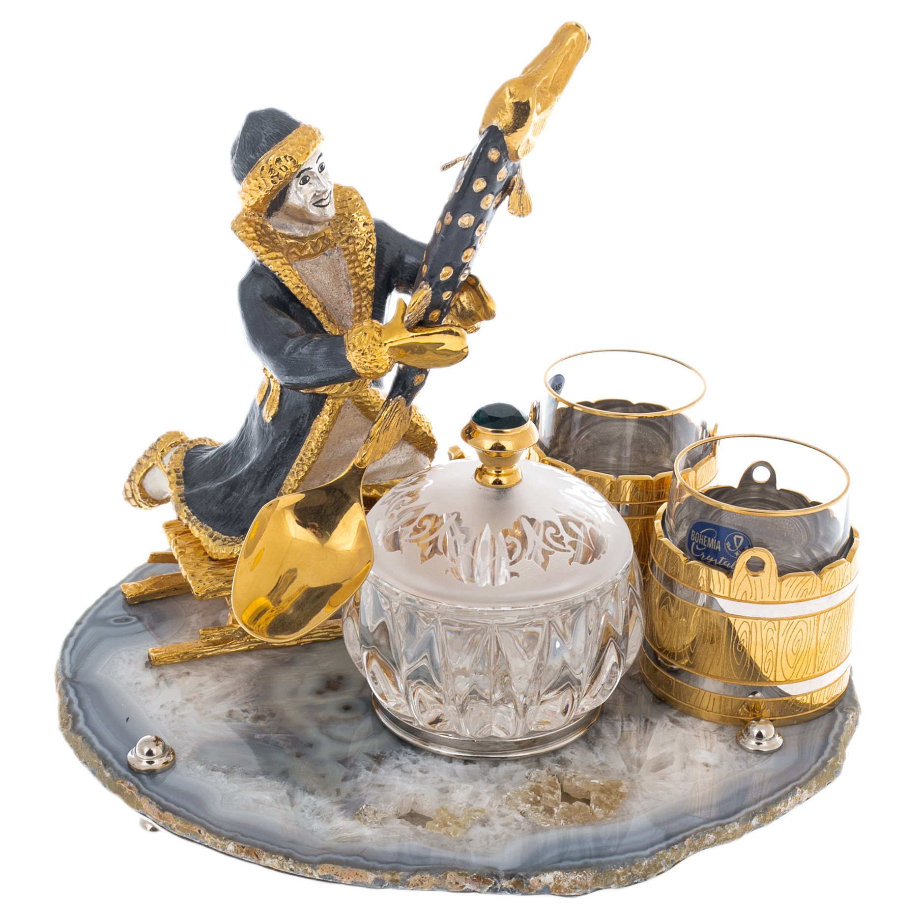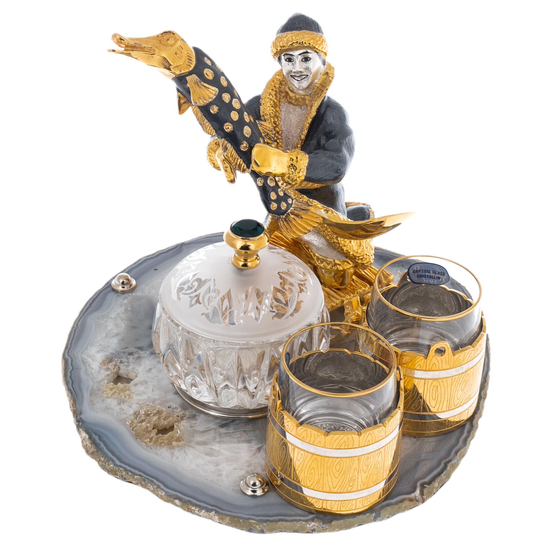 The figure of a fisherman wrapped in warm clothes and holding prey in his hands is a symbol of fortitude and endurance. Made of rare materials, it seems to come to life, conveying the feeling of cold, sparkling air and the endless expanse of frozen rivers. The gold and silver in the decor remind of the rays of the polar sun playing on the snowy expanses, and emphasize the uniqueness of each element of the set.