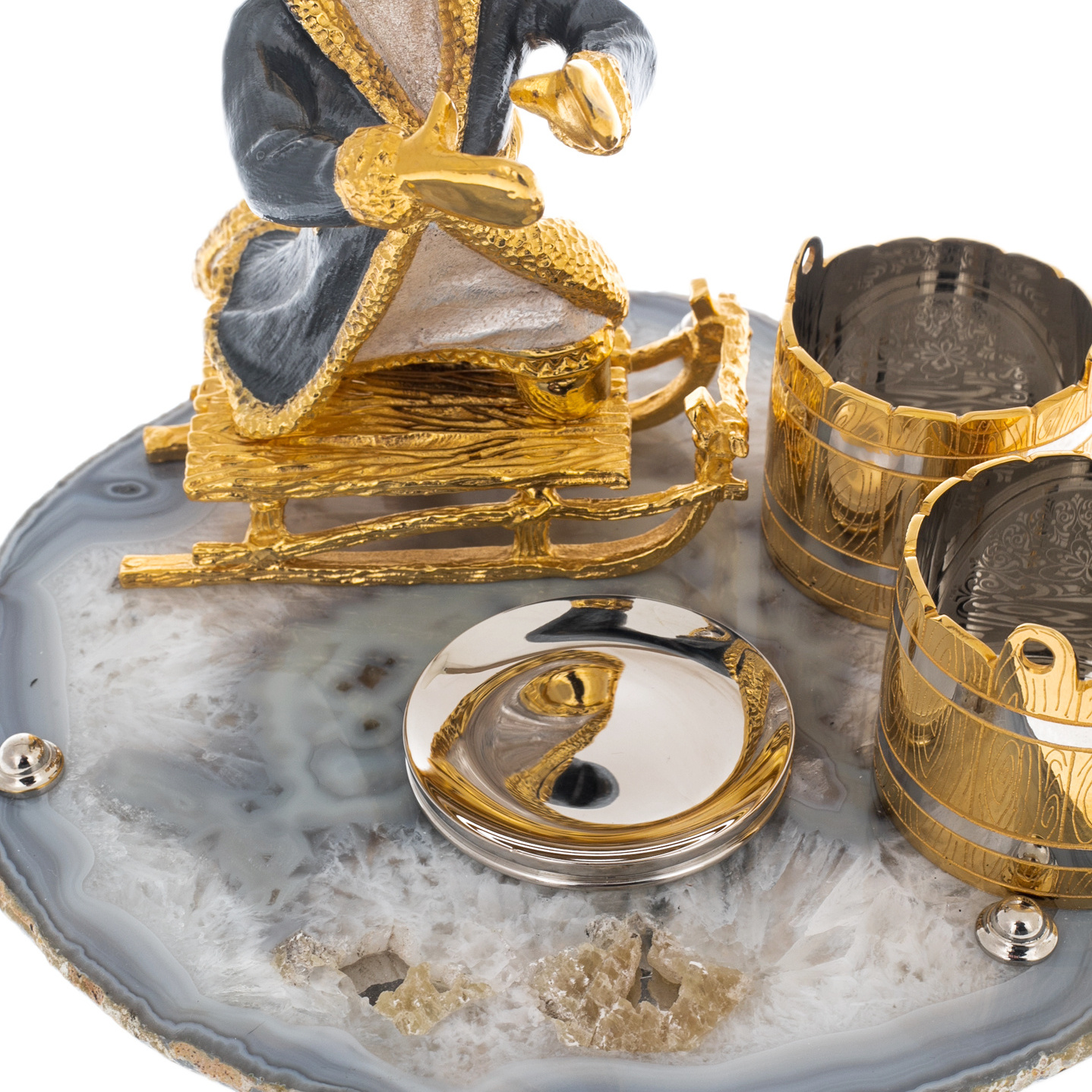 The base of the set is made of agate, the deep, iridescent shades of which symbolize the calm and powerful energy of the earth. The agate stand, with its cold luster and timeless textures, seems to be part of the ancient northern landscapes that hold the secrets of the past. This stone gives the set an aura of wisdom and mystery, as if transferred from the bowels of the earth.