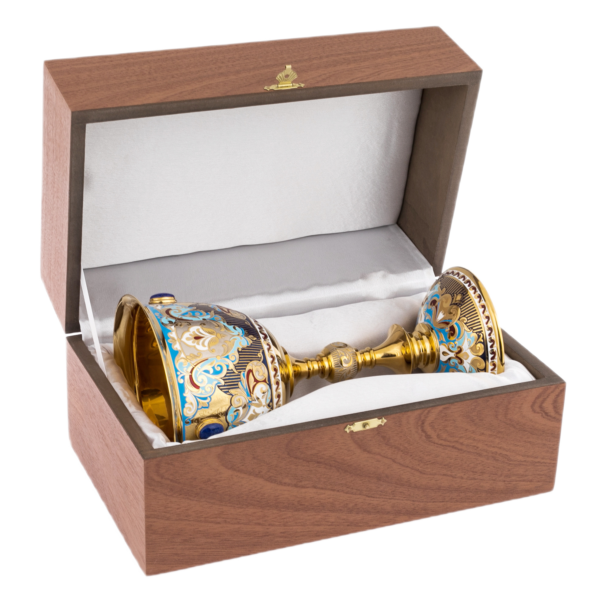 Each element is made with filigree precision, and the bright blue and gold tones of the enamel create a sense of harmony and richness. The cup, enclosed in an elegant wooden box, represents not just a luxury item, but a true treasure worthy only of a select few.