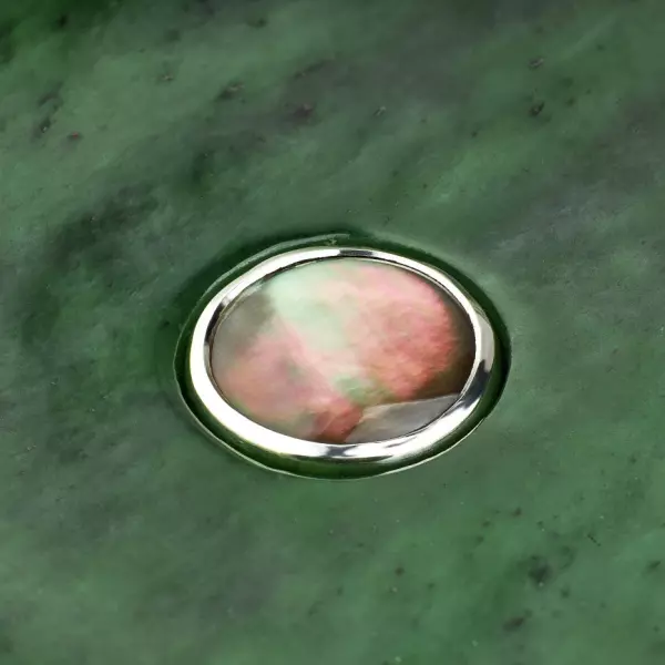 Нефрит, традиционно ценимый за свою прочность и особую энергетику, в этом наборе раскрывается не только как декоративный, но и как функциональный материал. Благодаря низкой теплопроводности камня чай дольше сохраняет температуру и постепенно раскрывает вкус, делая процесс чаепития более глубоким и созерцательным. Каждая деталь вытачивается вручную, что позволяет сохранить природный рисунок камня и подчеркнуть его естественную красоту. Серебряные элементы дополнены золочением и родированием, создавая тонкую игру оттенков — от холодного сияния до тёплого благородного света. В композиции также присутствует акцент из розового кварца, придающие изделию ювелирную завершённость.