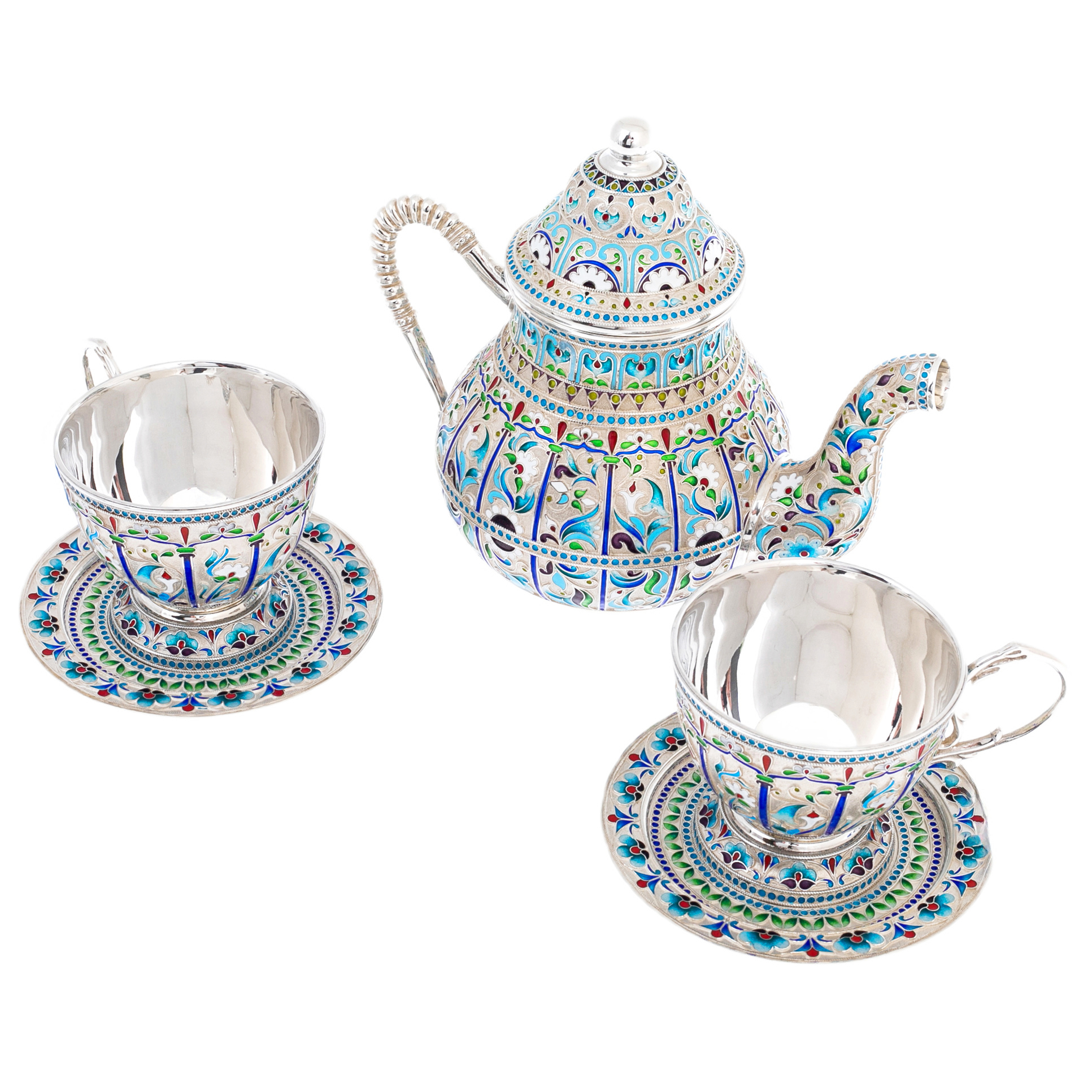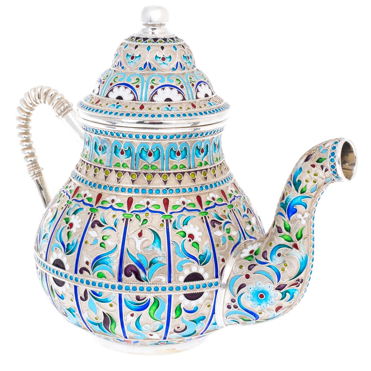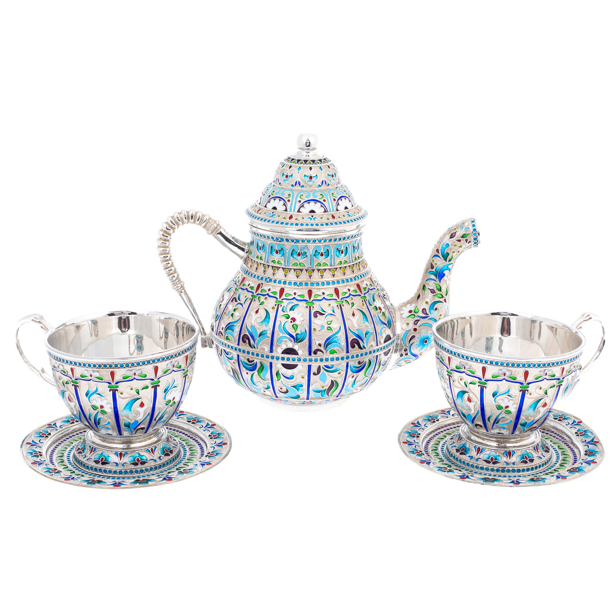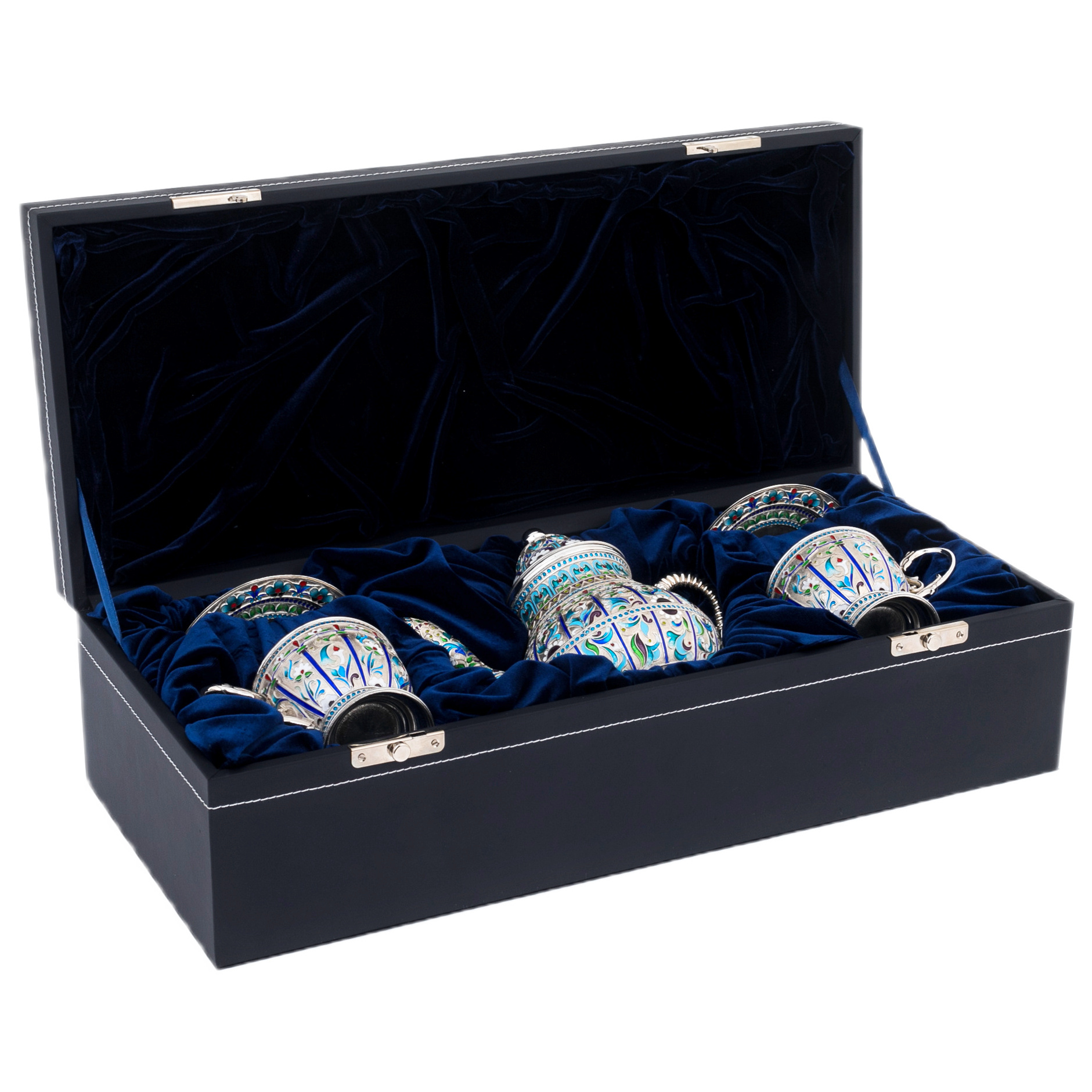 Чайный набор «Боярский» — воплощение старорусской утончённости, переданной через ювелирное искусство финифти и благородный блеск серебра. Каждая деталь — от чайника до чаш и блюдец — создана в духе дореволюционной роскоши, где чайная церемония являлась не просто обыденным действием, а важным социальным ритуалом. Корпус предметов украшен яркими орнаментами в традициях московской школы эмалирования: синие, зелёные и алые кобальтовые оттенки на серебряном фоне создают образ цветущего сада, заключённого в строгие симметричные рамки архитектурного рисунка. Формы чаш и носика чайника отсылают к старинным боярским сосудам, а витой обруч ручки повторяет силуэт старинного серебряного литья.