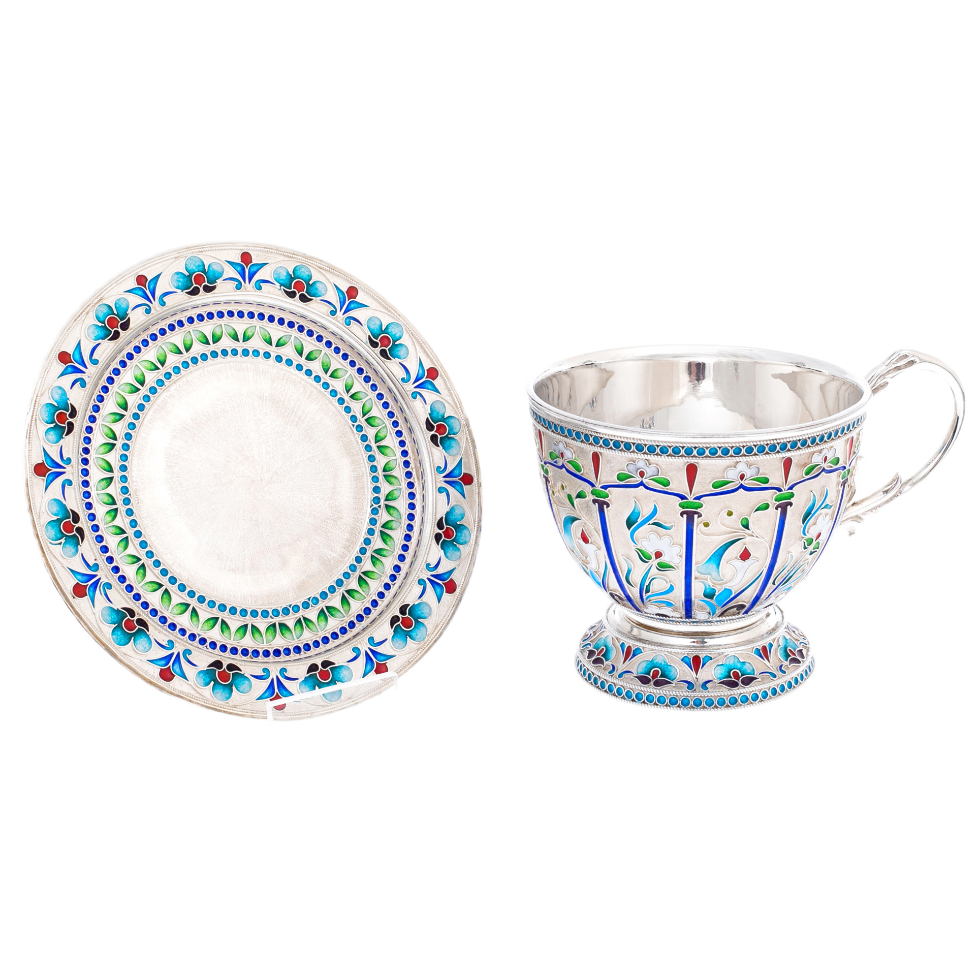 Набор выполнен в уникальной технике горячей перегородчатой финифти. Каждый элемент орнамента — результат кропотливой ручной работы: мастер формирует тонкие перегородки из скрученной проволоки, заполняет их эмалевыми составами, после чего изделия проходят многократный обжиг и шлифовку. Именно эта техника позволяет достичь насыщенности цвета, точности линий и визуальной глубины, превращая предметы в миниатюрные произведения искусства. Эмаль на серебре не выцветает, не теряет блеска и с годами только приобретает дополнительную выразительность. В каждом фрагменте читается не только эстетика, но и традиция, заложенная поколениями мастеров.