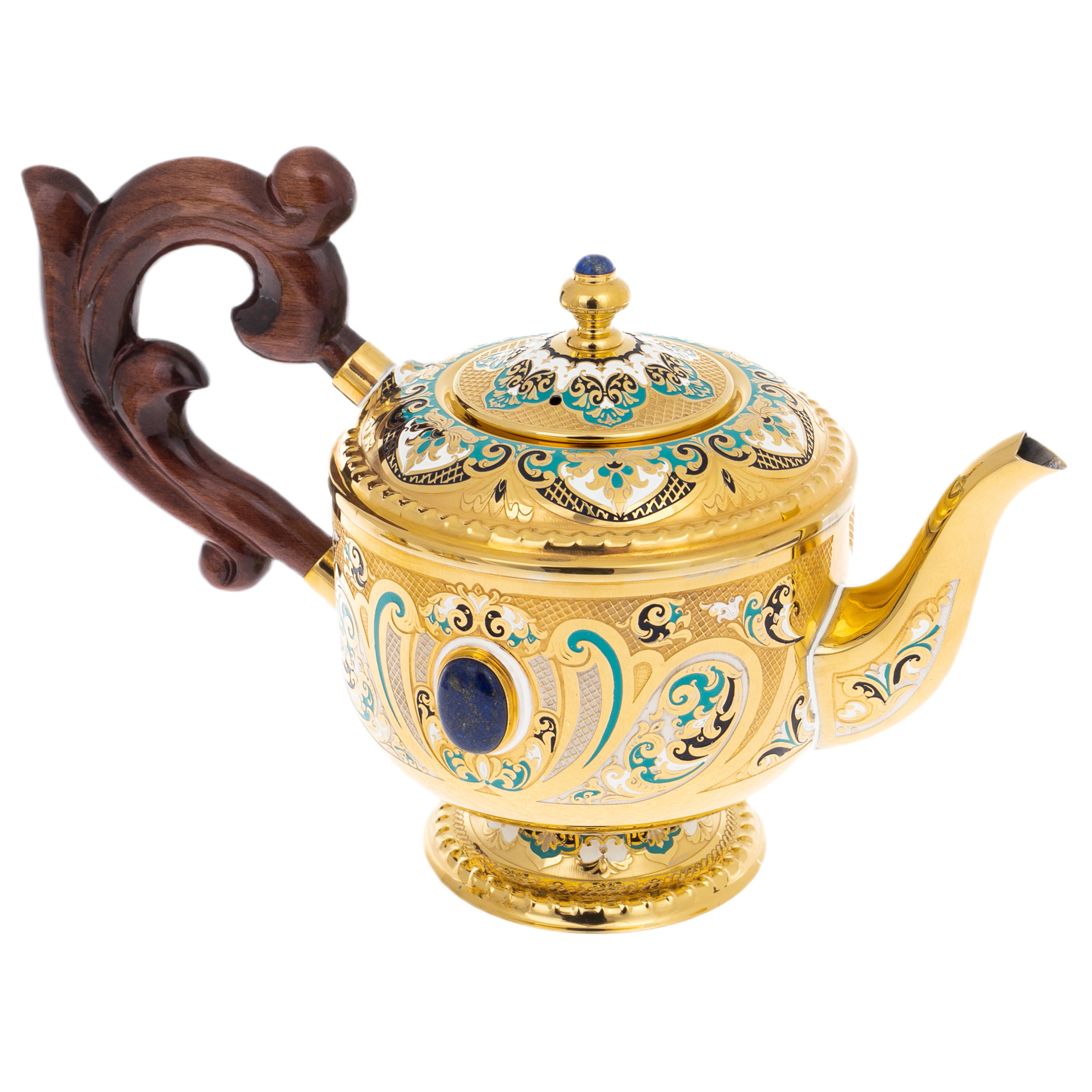 Чайник, украшенный филигранной гравировкой и эмалью, словно переносит в мир сказок, где каждое чаепитие превращается в ритуал, наполненный магией. Изящная деревянная ручка, вырезанная из благородных пород дерева, добавляет сервизу теплоту и комфорт, создавая ощущение гармонии и уюта.